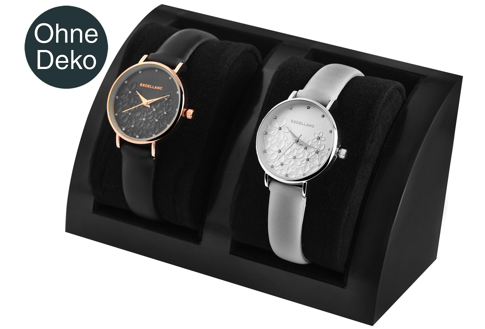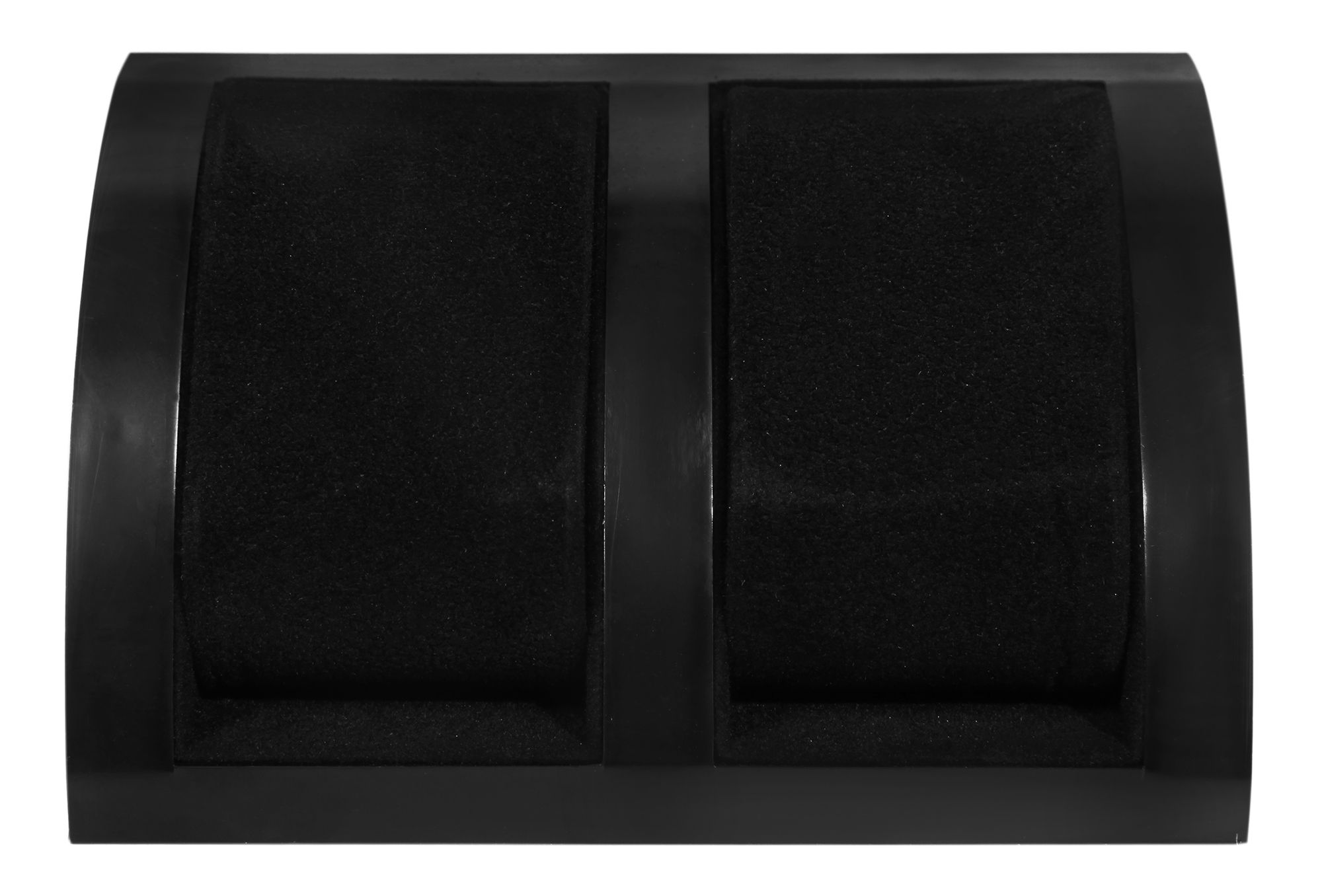 De display is gemaakt van kunststof en heeft een zwarte kleur. De display bevat ook twee plastic inzetstukken die bekleed zijn met zwarte fluwelen stof. De display is ideaal voor het presenteren van twee horloges. Op de toonbank, in de verkoopruimte of in de etalage, het ziet er overal goed uit en maakt een hoogwaardige indruk. De kussens van zwart fluweel zijn geschikt voor zowel heren- als damespolshorloges. De kussens zijn 7 cm lang, 4,5 cm breed en 4 cm diep. De basis is ook bekleed met zwart fluwelen stof zodat de display stevig staat. De display is 8,1 cm lang, 13,6 cm breed en 7,1 cm diep op het hoogste punt.