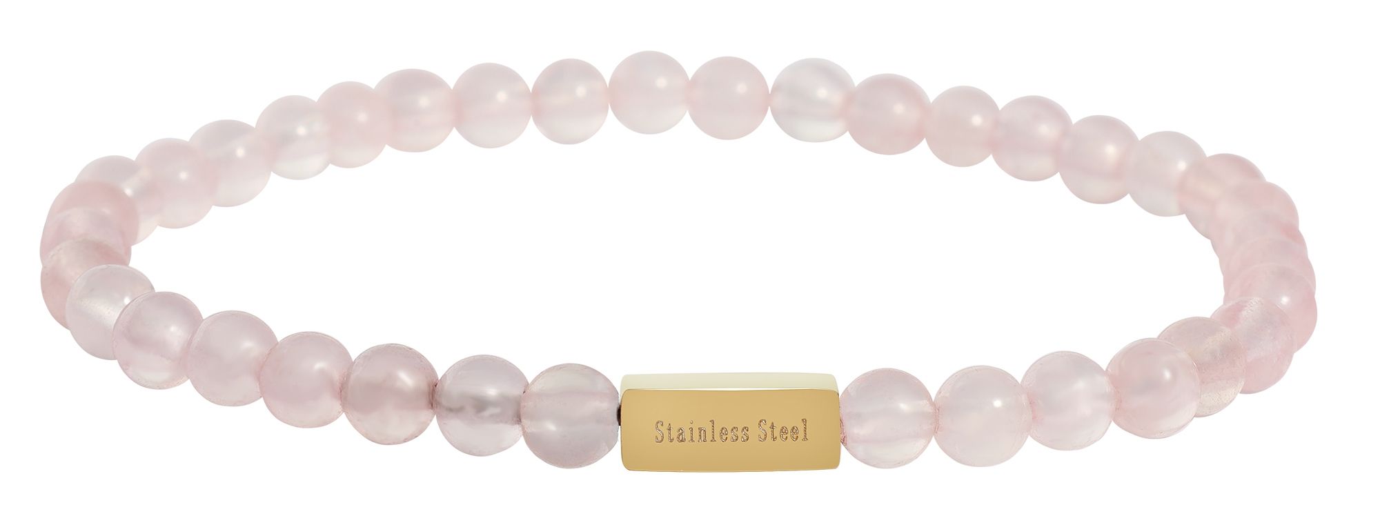 Natuurlijke accenten: Rozenkwarts kralenarmband met roestvrijstalen element.