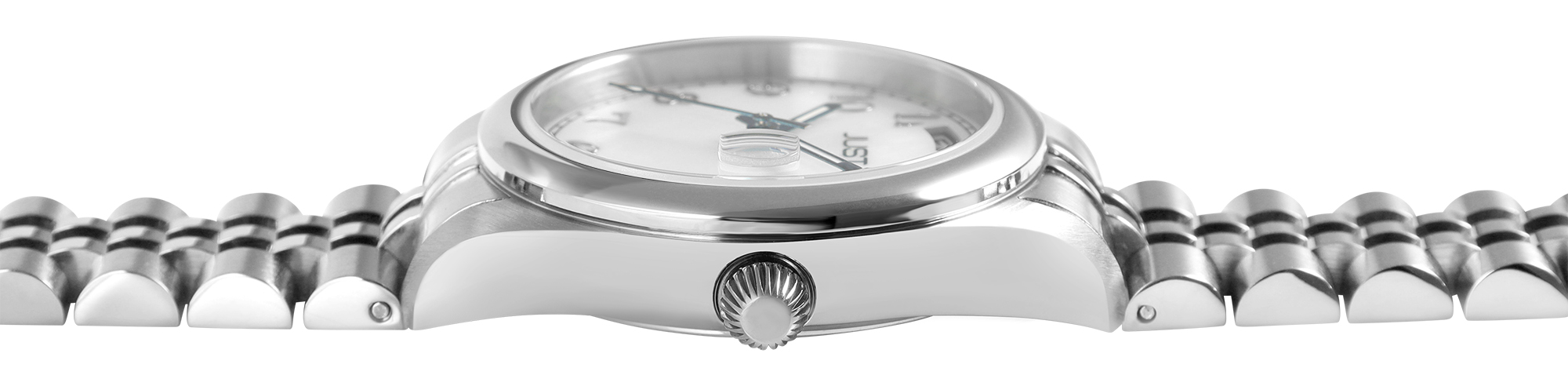 Met een diameter van 34 mm en een hoogte van 9 mm heeft de roestvrijstalen kast een harmonieus formaat dat er geweldig uitziet om elke pols.