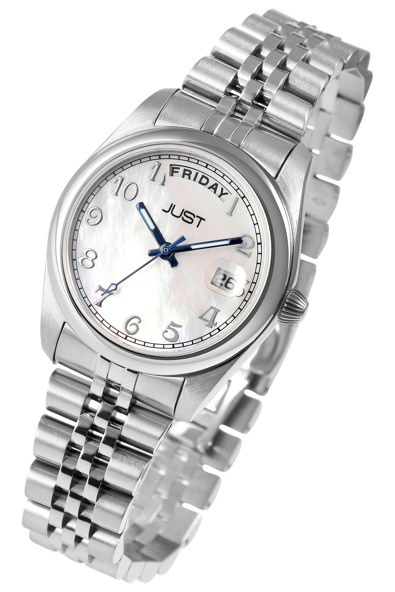 Productinformatie "JUST dameshorloge "Felicitas" met roestvrij stalen armband, 5ATM, zilverkleurig + parelmoer"