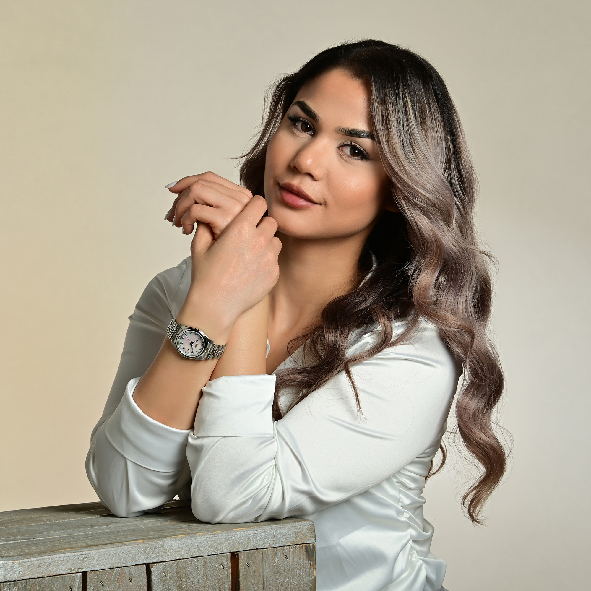 De glinsterende parelmoeren wijzerplaat is een echte blikvanger en wordt aangevuld met een eenvoudige lijnindex of, zoals bij de 004- en 005-versies, een Arabische wijzerplaat. De tijd is nog steeds goed af te lezen in slechte lichtomstandigheden dankzij de lichtgevende uurmarkeringen en wijzers. Een extra datum- en weekdagweergave benadrukt de functionaliteit van dit stijlvolle horloge.