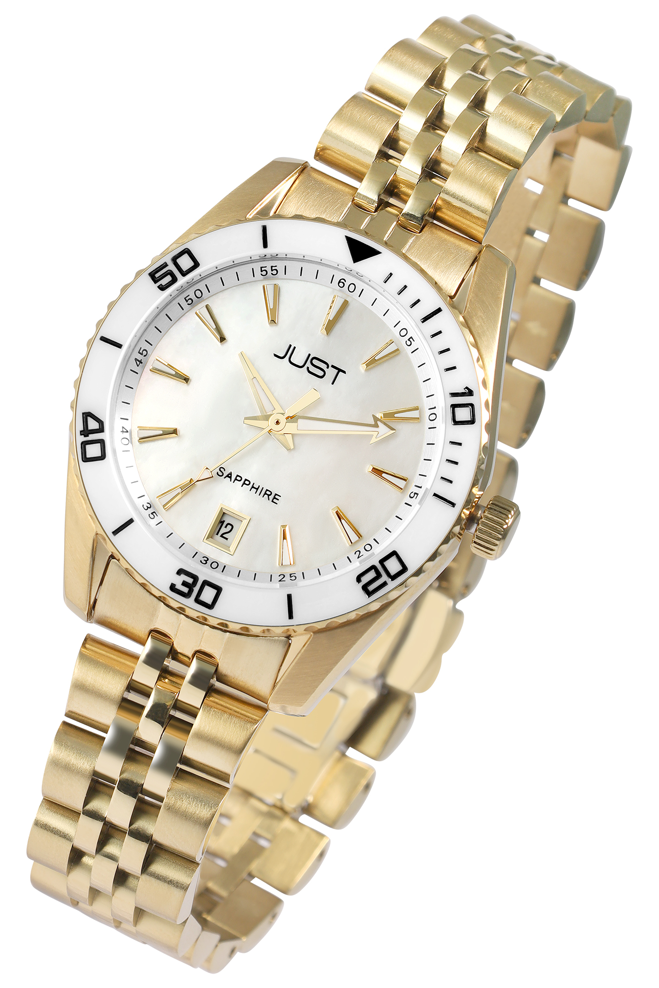 Productinformatie "JUST Damenuhr "Levana" mit Edelstahlarmband, 5ATM, goldfarbig + perlmutt mit weißer Lünette"