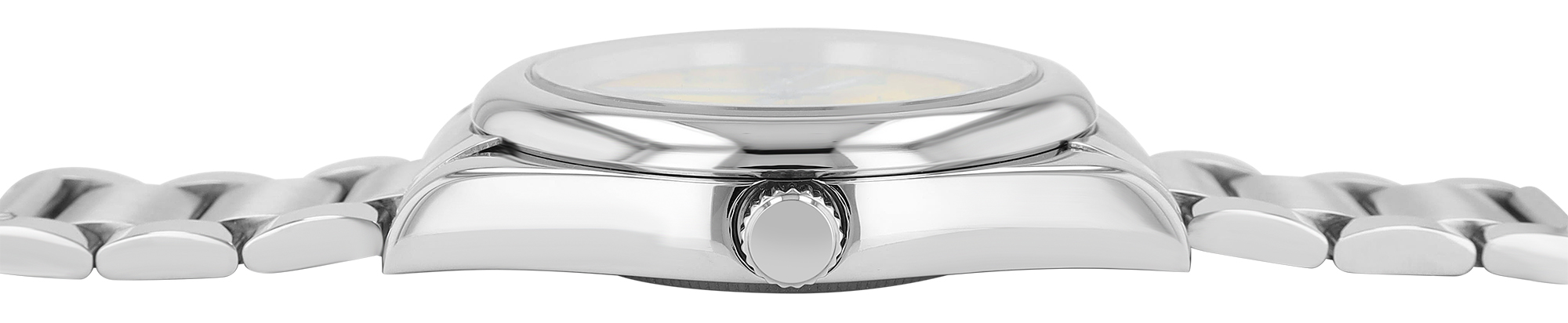 De ronde roestvrijstalen kast (41 mm diameter, 13 mm hoog) zorgt voor een eenvoudige look die perfect wordt aangevuld door de heldere wijzerplaat met Arabische cijfers en lichtgevende wijzers. De praktische datumweergave rondt de wijzerplaat perfect af.