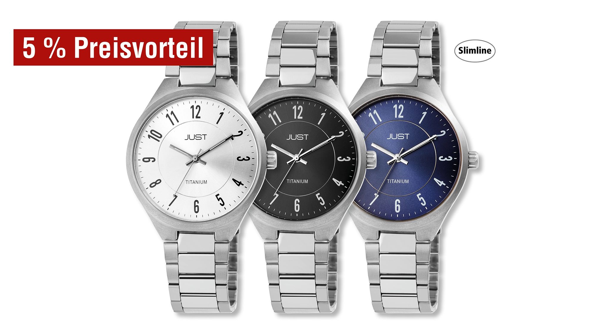 JUST titanium dameshorloges met titanium armband, JU10192 in een set van 3 met 5% prijsvoordeel. Het analoge dameshorloge van het merk Just heeft een hoogwaardig quartz uurwerk. De titanium band heeft een breedte van 18 mm. De totale lengte is 23 cm. De titanium kast met mineraalglas heeft een diameter van 38 mm en een kasthoogte van 7,5 mm. Het horloge is getest op een druk van 5 ATM. Set bestaande uit: 1x titanium kast met zilverkleurige wijzerplaat, titanium band 1x titanium kast met zwarte wijzerplaat, titanium band 1x titanium kast met blauwe wijzerplaat, titanium band