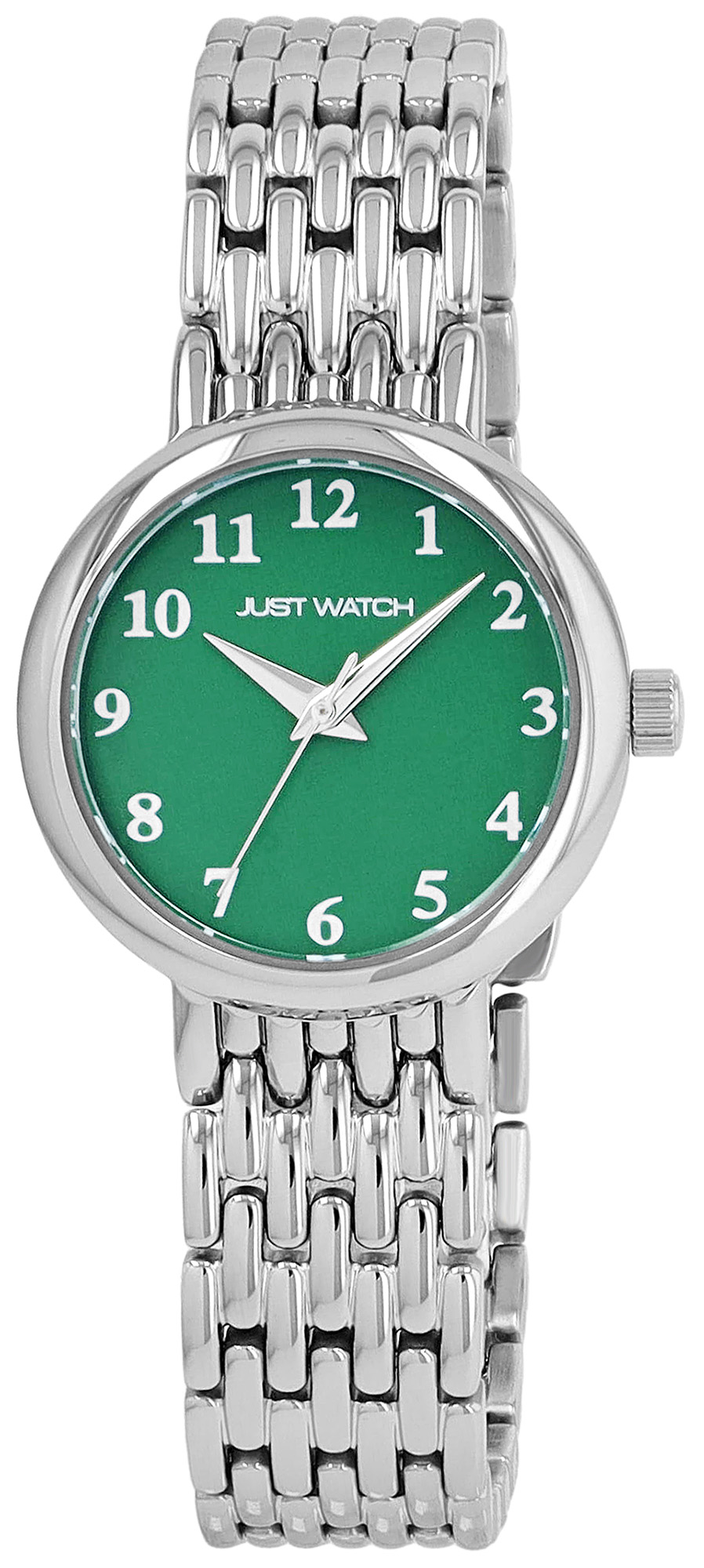Productinformatie "JUST WATCH Damenuhr "Akari" mit Edelstahlband, geflochten, Ø 28 mm, 5 ATM, silberfarben/grün"