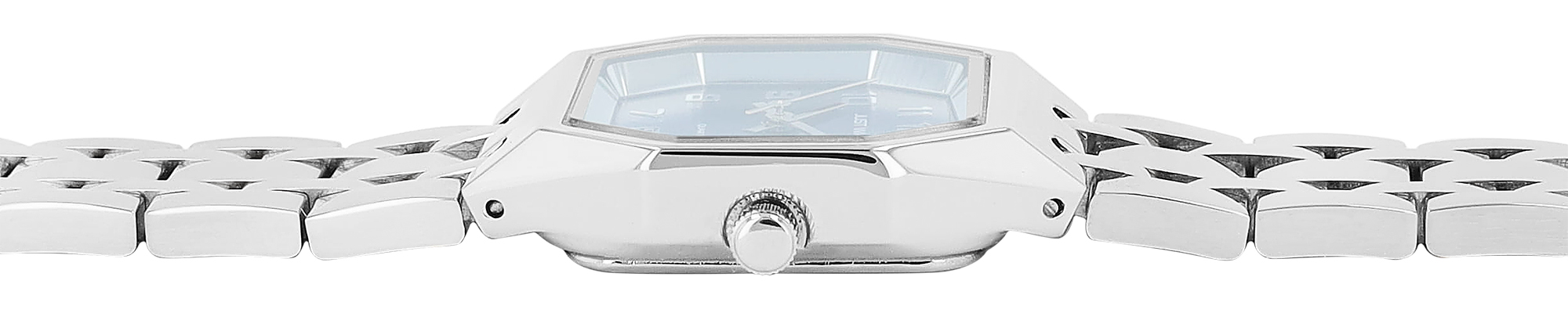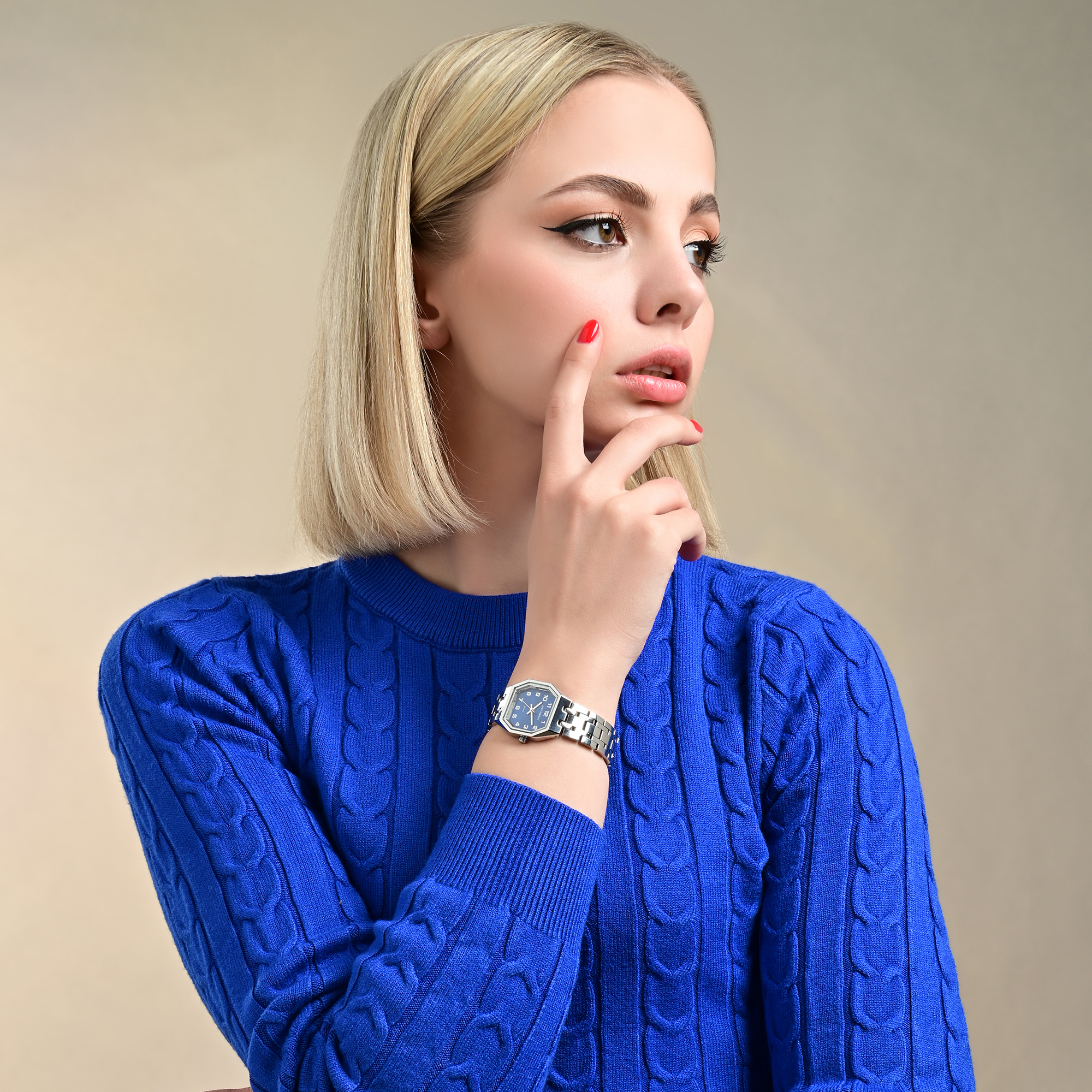 De achthoekige kast (26 x 25 x 7,5 mm) geeft dit dameshorloge een speciale touch. De wijzerplaat is voorzien van duidelijke Arabische cijfers die zorgen voor een goede leesbaarheid. De eenvoudige uur-, minuten- en secondewijzers benadrukken de elegante uitstraling.