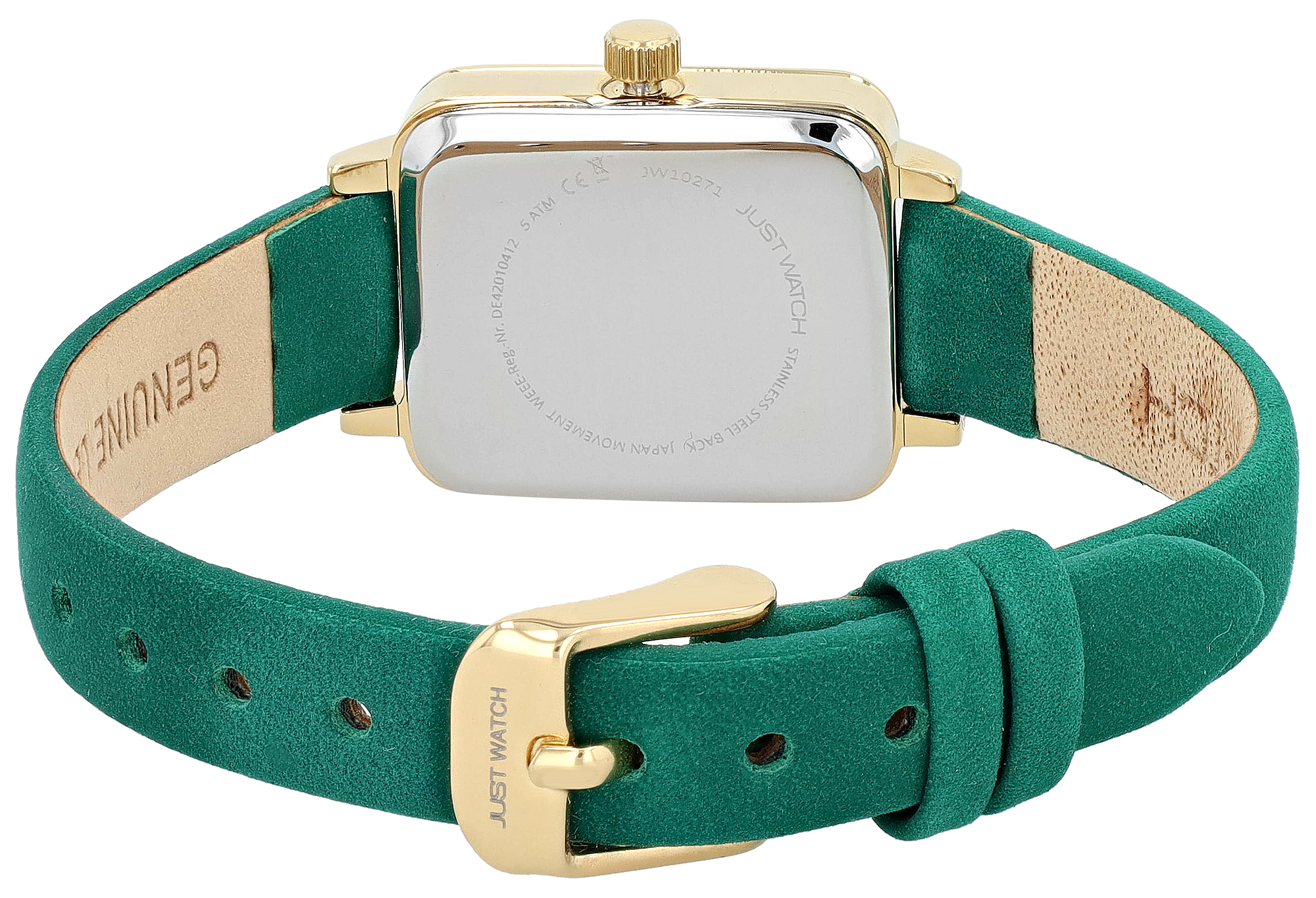 Productinformatie "JUST WATCH Damenuhr "Aveline" mit Echtlederband, eckiges Design, grün/ goldfarben"