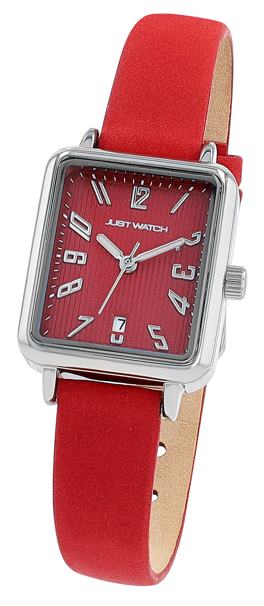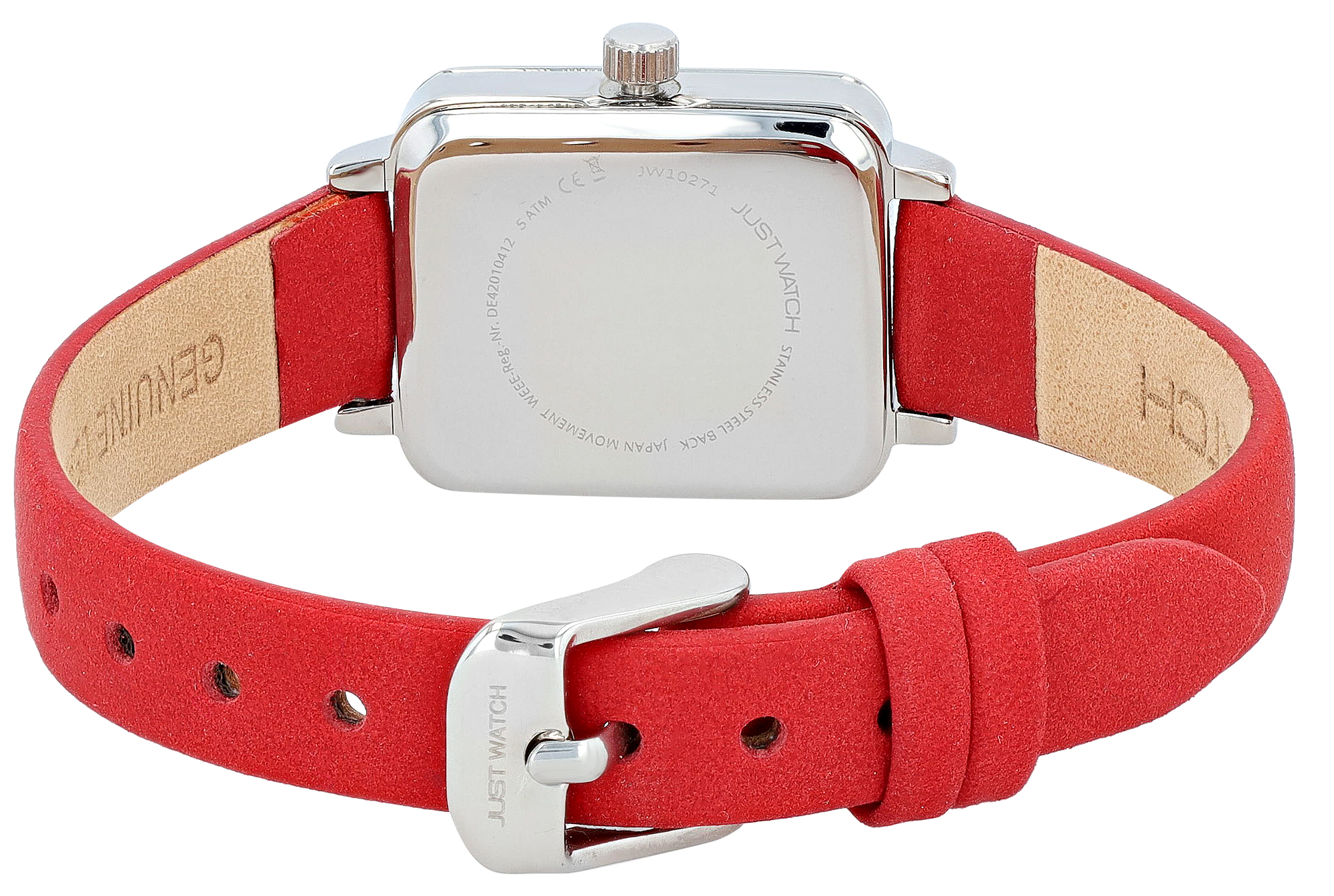 Productinformatie "JUST WATCH Damenuhr "Aveline" mit Echtlederband, eckiges Design, rot/ silberfarben"