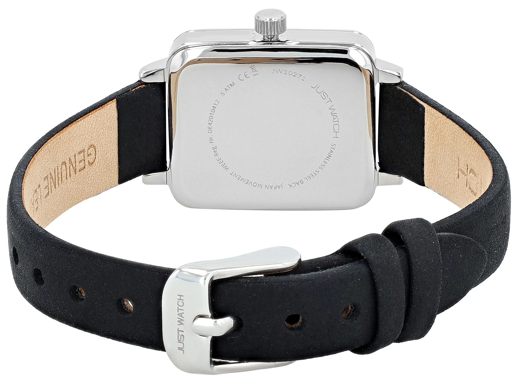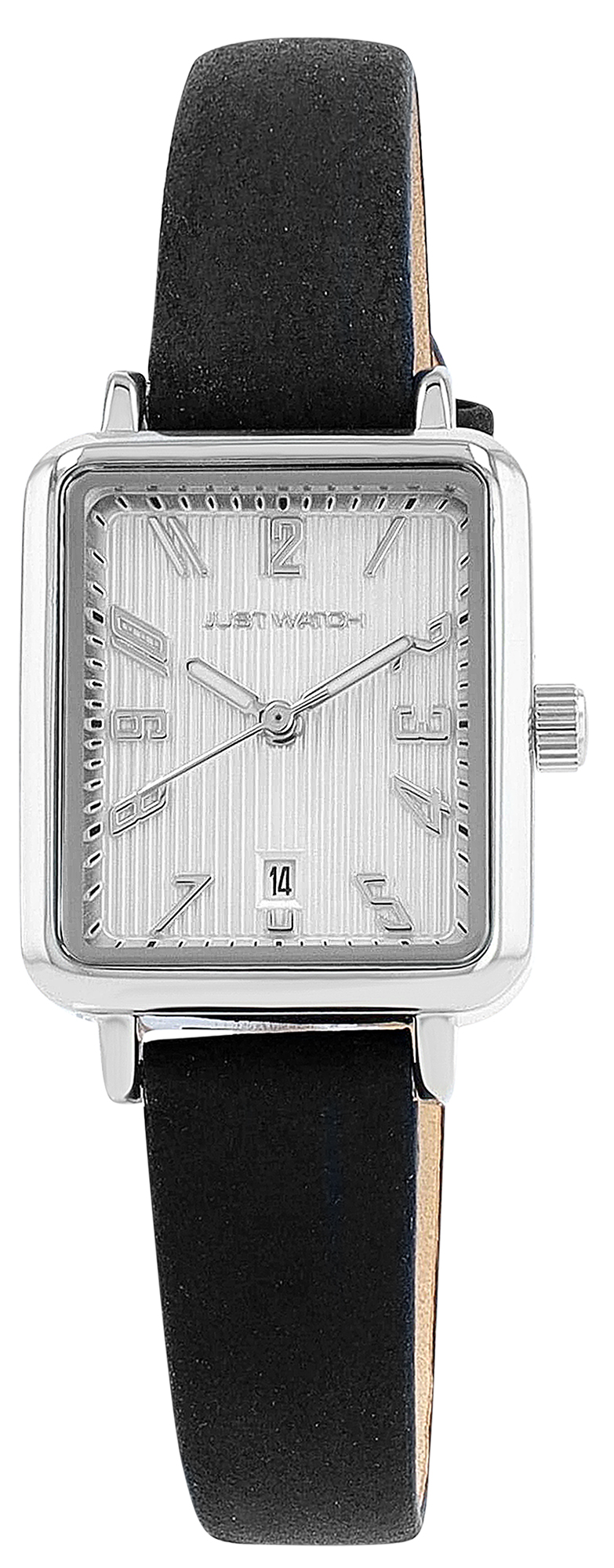 Productinformatie "JUST WATCH Damenuhr "Aveline" mit Echtlederband, eckiges Design, schwarz/ silberfarben"