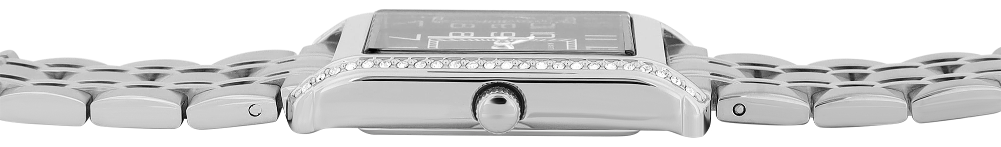 Een klassiek dameshorloge met moderne elementen, Similis-stenen langs de lange zijden van de klassieke rechthoekige kast van 30 x 24 mm in lengte en breedte en 8 mm in hoogte: een ongebruikelijke wijzerplaat met grote Arabische cijfers en een streepindex rond het midden van de wijzerplaat, die niet alleen functioneel maar ook stijlvol is en het horloge een moderne chique uitstraling geeft. De achterkant van de kast en de klassieke schakelarmband van het horloge in conische stijl, 18 mm breed bij de brug, met afwisselend gepolijste en matte schakelelementen, zijn gemaakt van hoogwaardig roestvrij staal, dat bekend staat om zijn hypoallergene en corrosiebestendige eigenschappen.