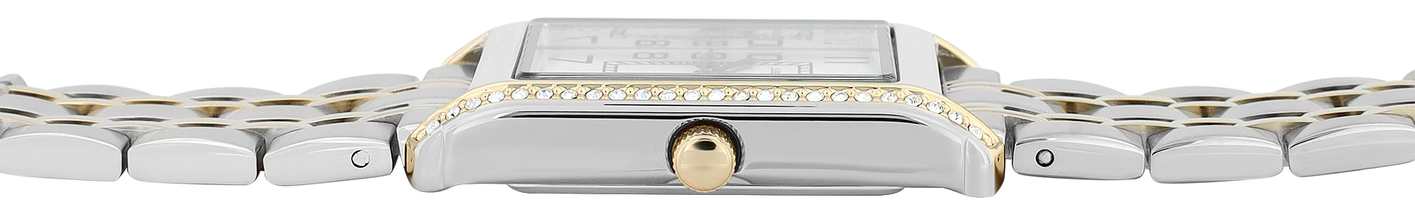 Een klassiek dameshorloge met moderne elementen, Similis-stenen langs de lange zijden van de klassieke rechthoekige kast van 30 x 24 mm in lengte en breedte en 8 mm in hoogte: een ongebruikelijke wijzerplaat met grote Arabische cijfers en een streepindex rond het midden van de wijzerplaat, die niet alleen functioneel maar ook stijlvol is en het horloge een moderne chique uitstraling geeft. De achterkant van de kast en de klassieke schakelarmband van het horloge in conische stijl, 18 mm breed bij de brug, met afwisselend gepolijste en matte schakelelementen, zijn gemaakt van hoogwaardig roestvrij staal, dat bekend staat om zijn hypoallergene en corrosiebestendige eigenschappen.