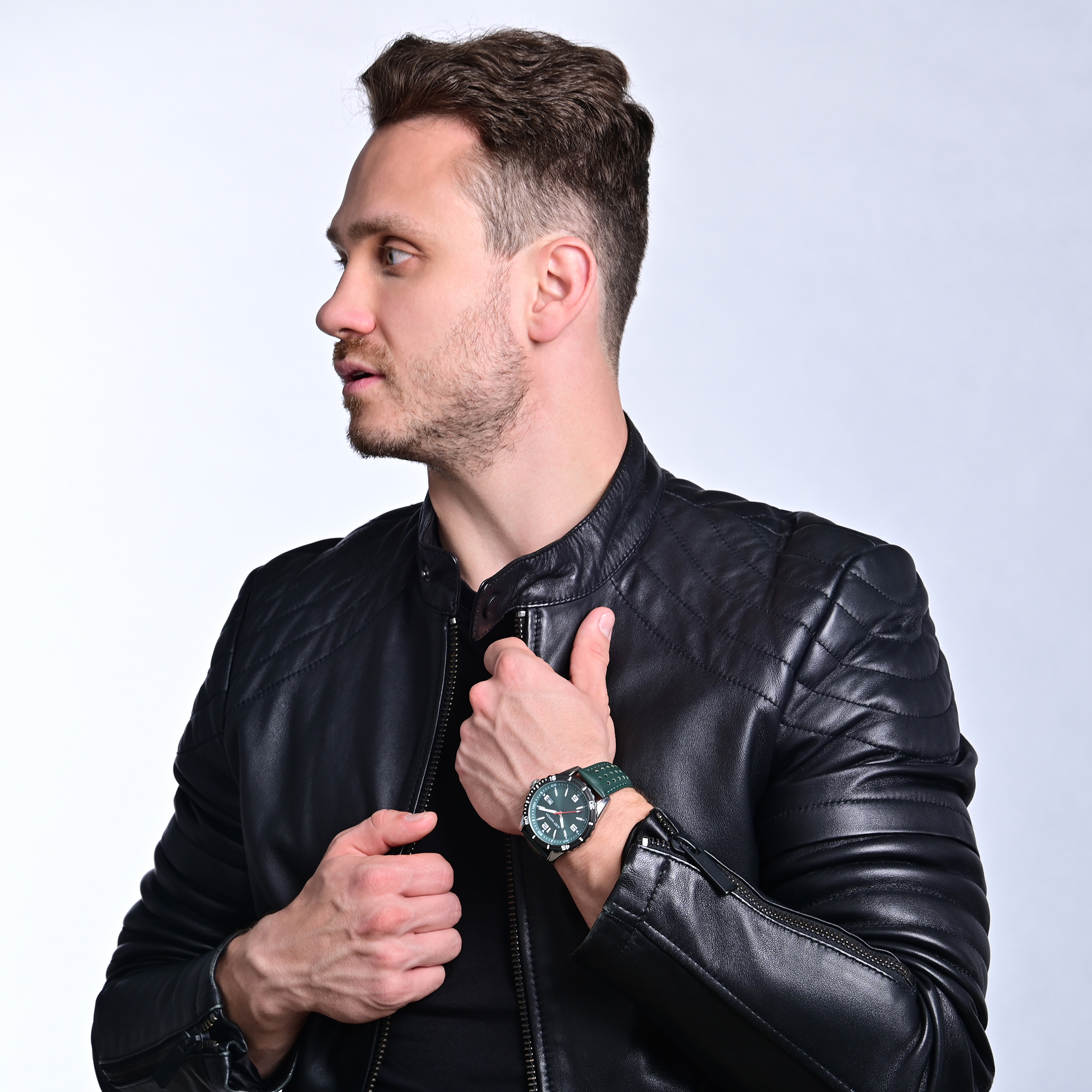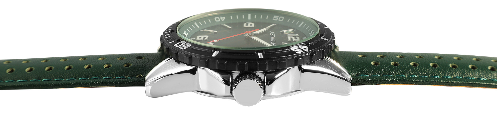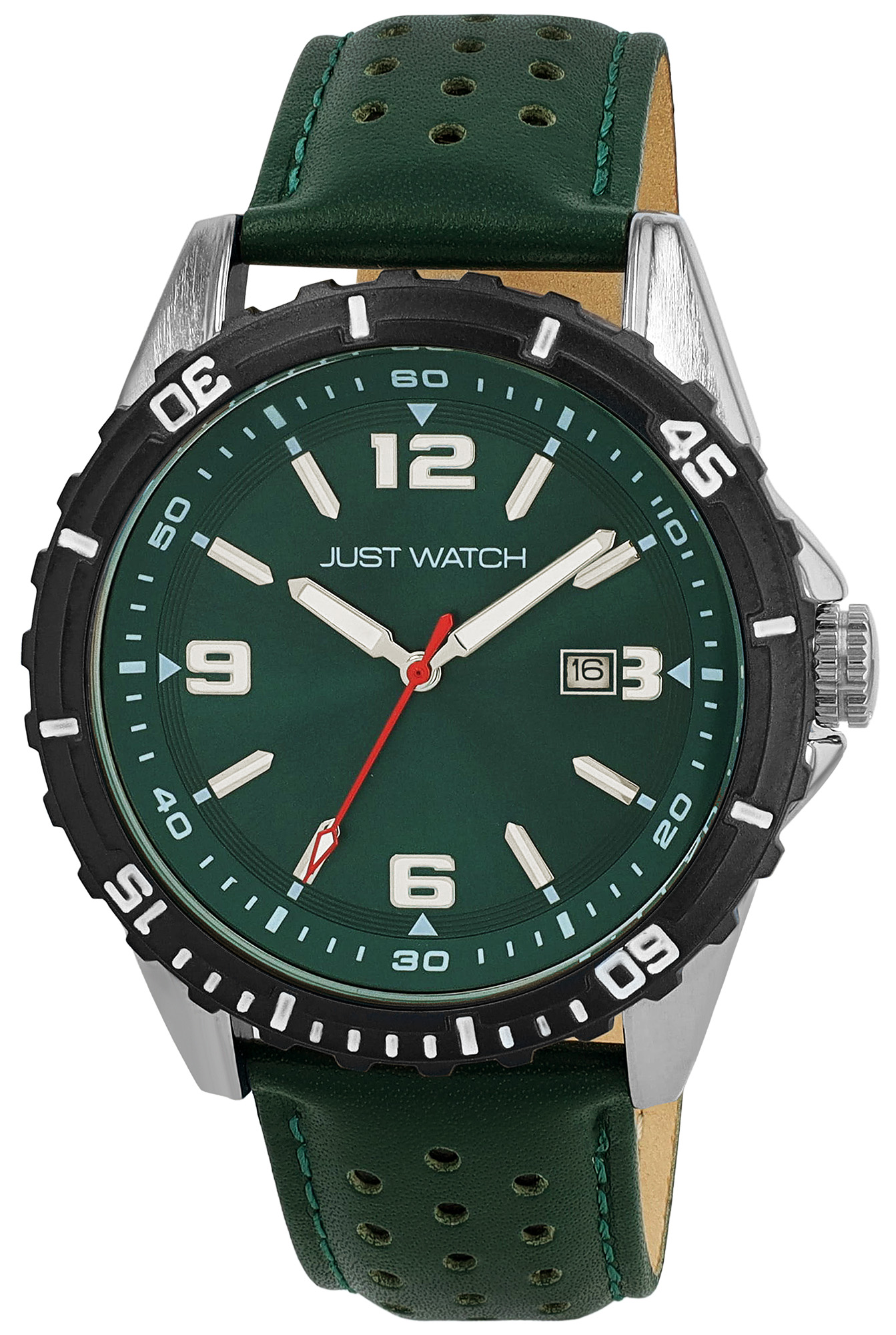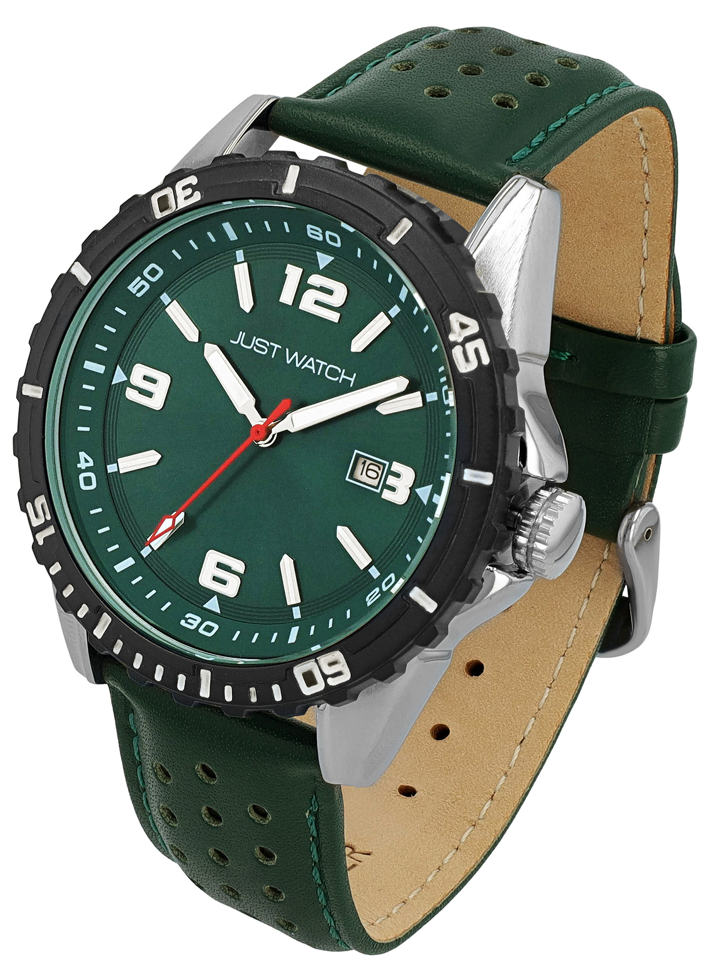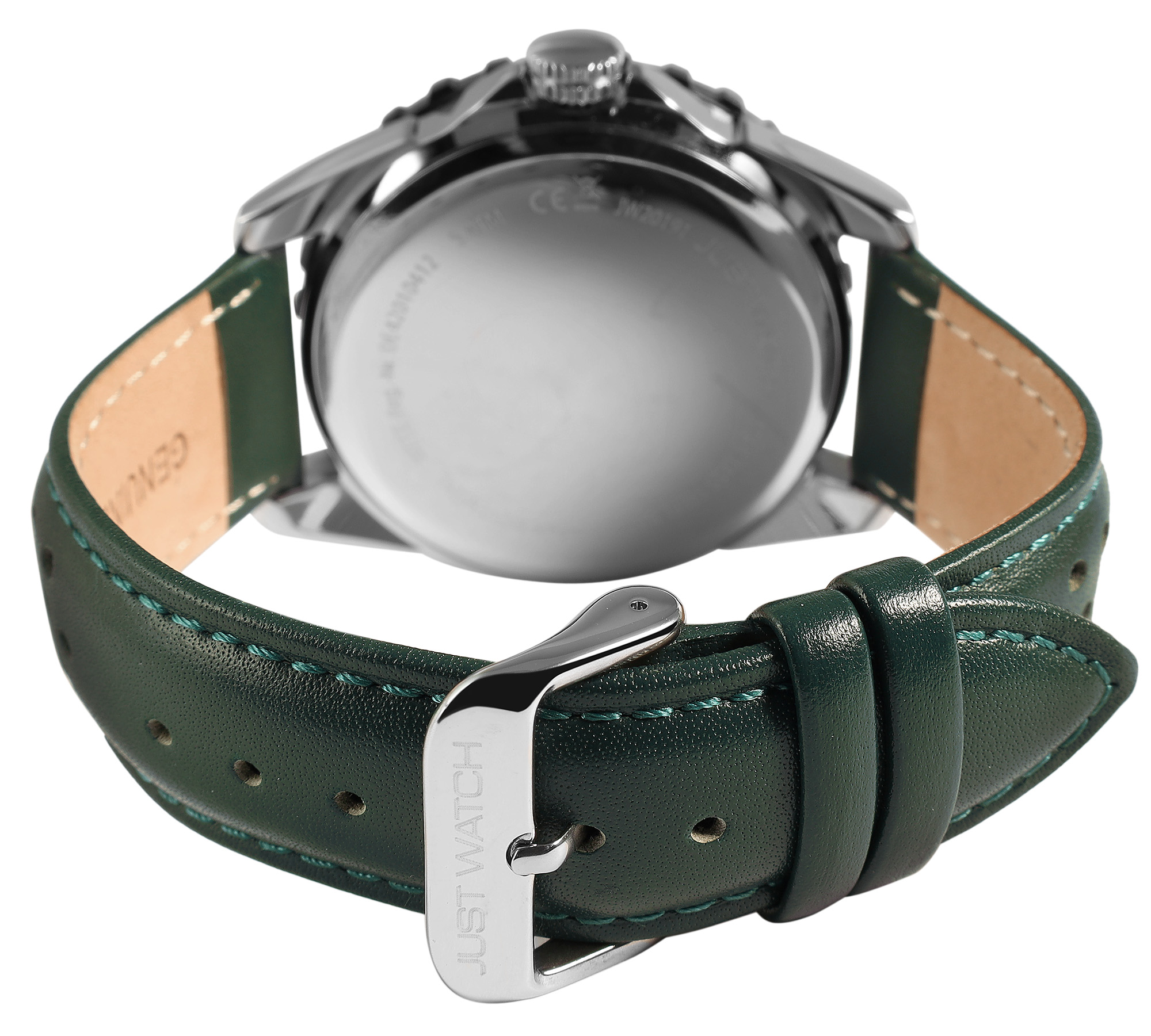 Productinformatie "JUST WATCH herenhorloge "Elwin" met echt lederen band, Ø 43 mm, groen/zilverkleurig/zwart"