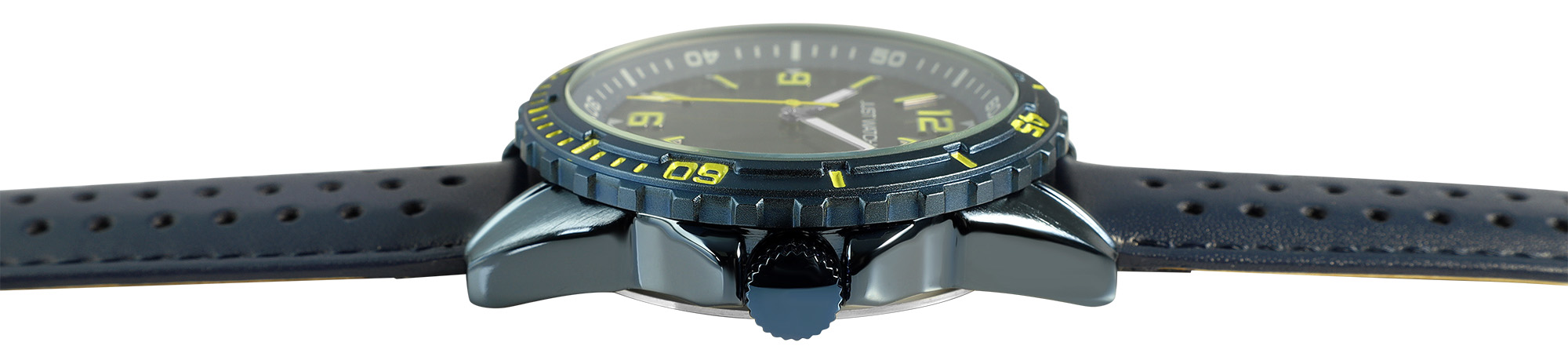 De metalen kast met een diameter van 43 mm en een hoogte van 15 mm geeft "Elwin" een opvallende, mannelijke uitstraling. De draaiende lunette en de sportieve wijzerplaat met Arabische cijfers, stickindex en datumaanduiding benadrukken de dynamische look. Lichtgevende wijzers zorgen voor optimale leesbaarheid, terwijl het mineraalglas extra bescherming biedt. Met een waterbestendigheid van 5ATM is het horloge perfect om elke dag te dragen.