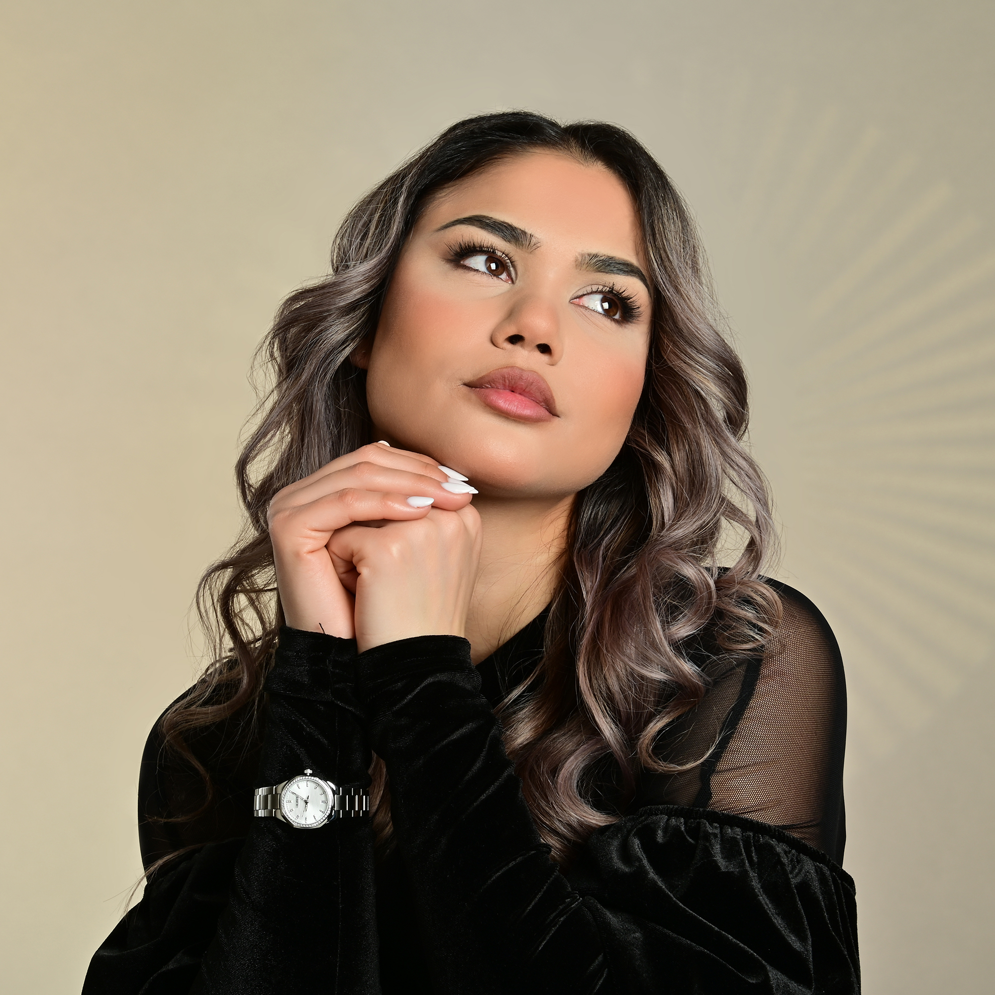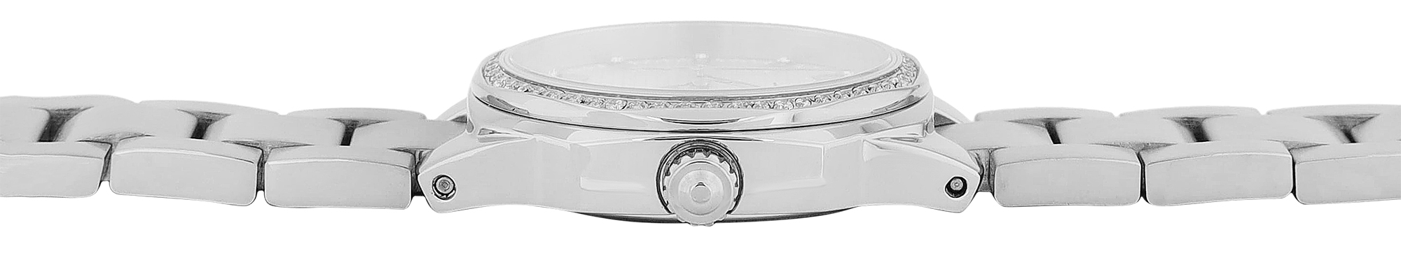 De streepindex wordt versterkt door elegante afwerking en geeft het horloge een vleugje luxe. De bezel, die rondom is versierd met sierstrips, benadrukt de vrouwelijke elegantie van dit model. De wijzerplaat met zijn fijne, horizontale lijnenpatroon zet stijlvolle accenten.