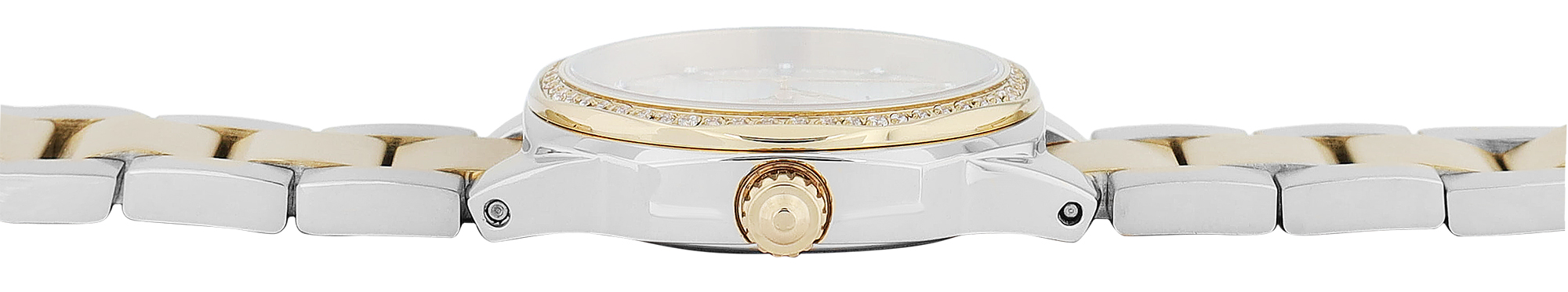 De streepindex wordt versterkt door elegante afwerking en geeft het horloge een vleugje luxe. De bezel, die rondom is versierd met sierstrips, benadrukt de vrouwelijke elegantie van dit model. De wijzerplaat met zijn fijne, horizontale lijnenpatroon zet stijlvolle accenten.