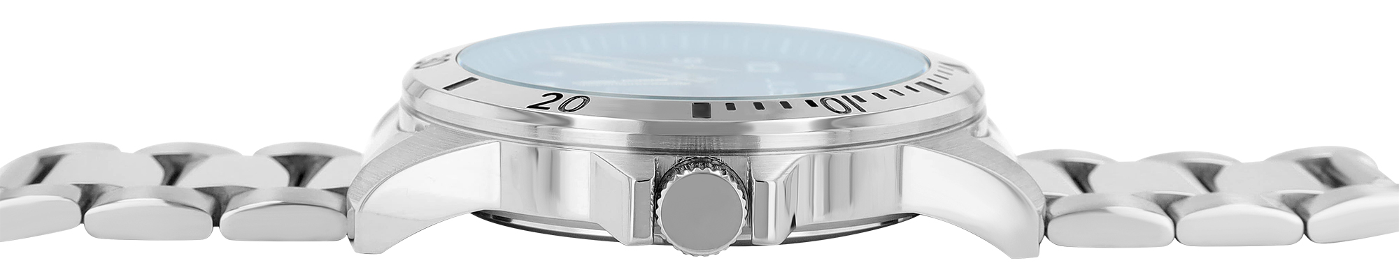 De opvallende roestvrijstalen kast (43 mm diameter) is voorzien van een vaste lunette, die het horloge een sportieve look geeft. Het mineraalglas beschermt de heldere wijzerplaat met Arabische cijfers, terwijl de lichtgevende wijzers zorgen voor een goede leesbaarheid. Een praktische datumweergave maakt de functionaliteit van het horloge compleet.