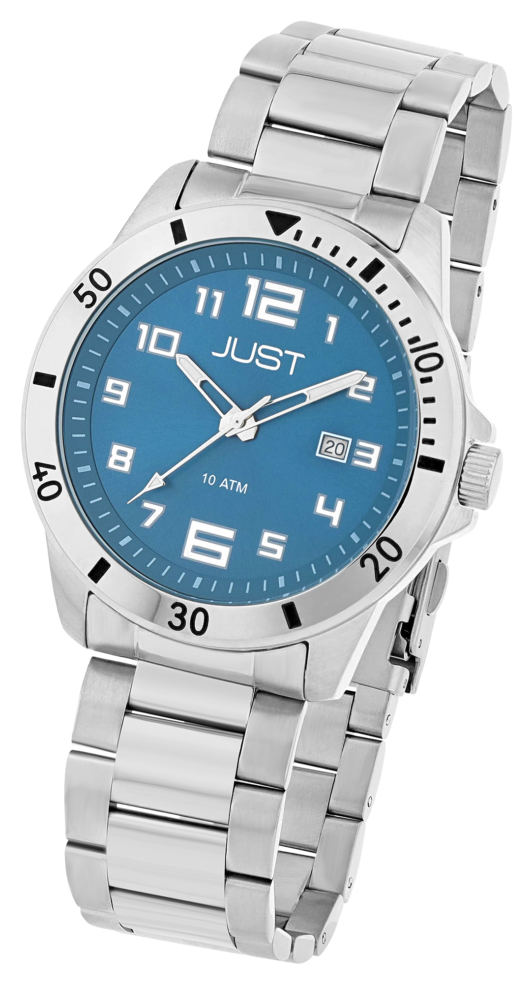 Productinformatie "JUST herenhorloge "Roman" met roestvrijstalen armband, Ø 43 mm, 10 ATM, zilverkleurig/blauw"