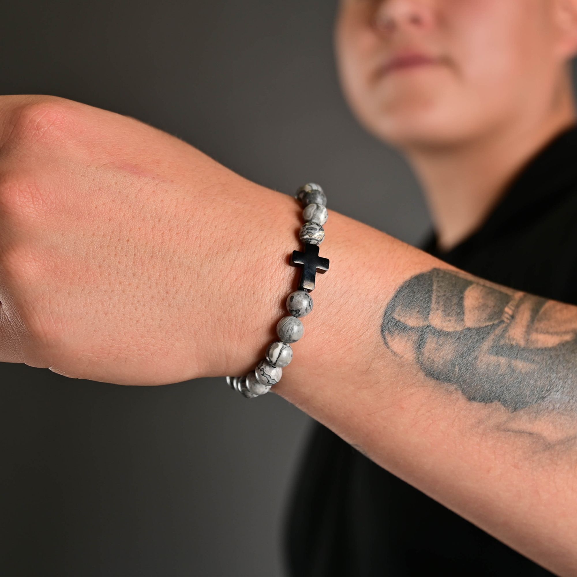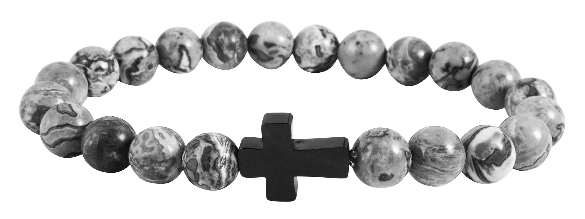 De Akzent kralenarmband is gemaakt van echt natuursteen en roestvrij staal en wordt bij elkaar gehouden met een elastische nylon rubberen band. Omdat de kralen een natuurproduct zijn, is elke kraal uniek. De armband bestaat uit 22 kralen en 1 roestvrijstalen kruis. De afmetingen zijn: lengte: 18 cm en dikte: 8 mm.