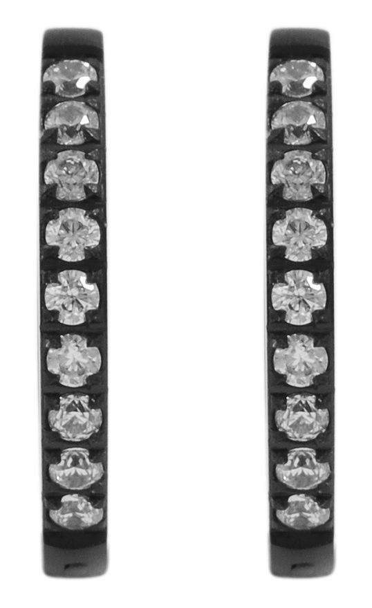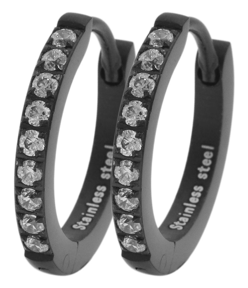 De scharnierende oorbellen met accent zijn gemaakt van roestvrij staal en hebben ook een IP-coating. Deze coating draagt bij aan een betere krasbestendigheid en uitstraling. De oorbellen zijn zwart van kleur. De oorbellen zijn bovendien bezet met 9 fonkelende similli steentjes per hoepeloorbel. Het materiaal heeft een matte afwerking. De oorbellen kunnen gemakkelijk geopend en gesloten worden met de sluiting. Het item heeft de volgende afmetingen: Diameter: 12 mm, breedte 2 mm en dikte 2 mm.