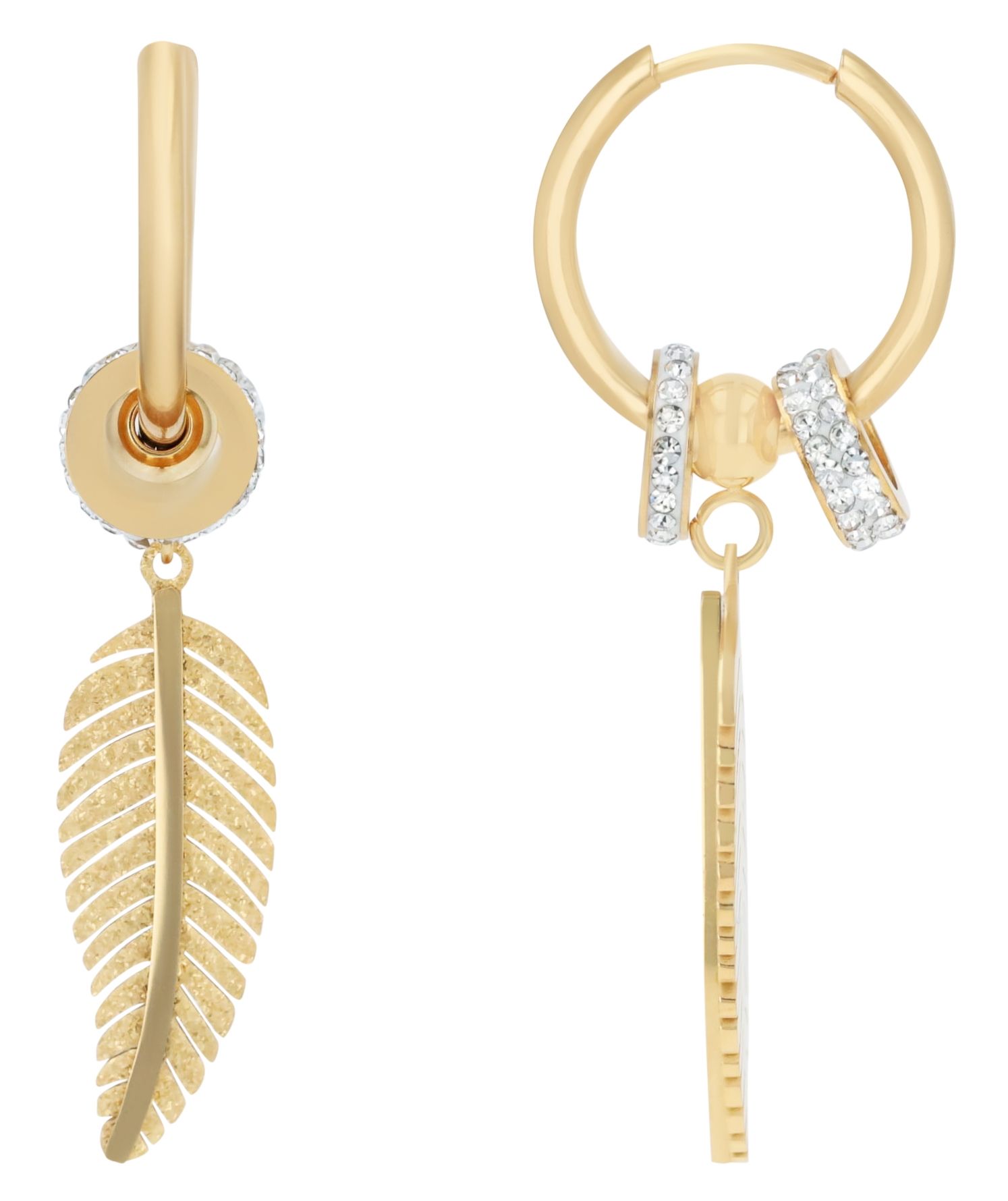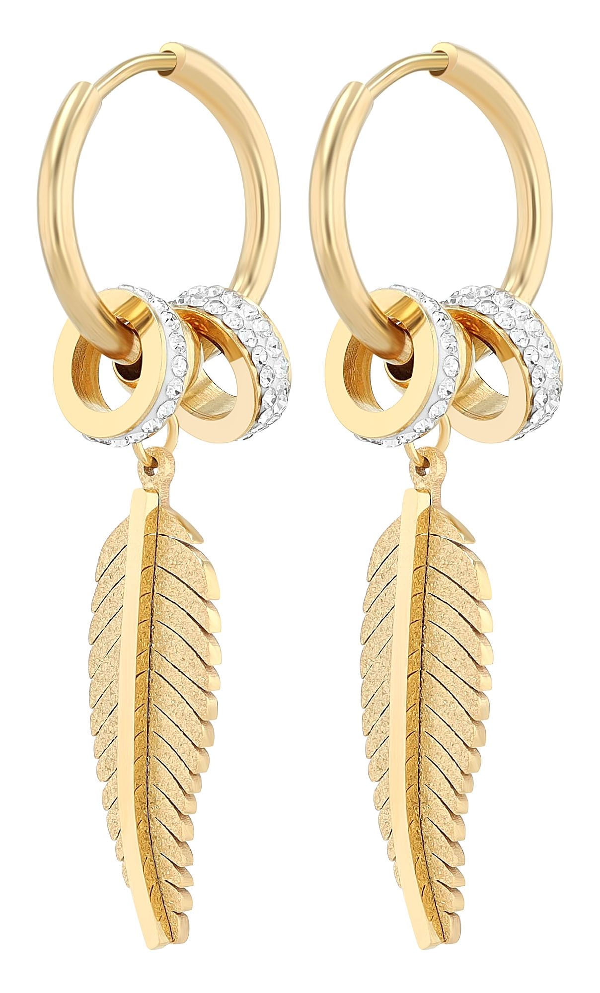 Elke creool heeft een veervormige hanger en twee ronde elementen met glinsterende randen. Deze elementen zijn beweegbaar en kunnen worden verwisseld of verwijderd afhankelijk van je stemming of outfit, zodat je looks op maat kunt creëren.
