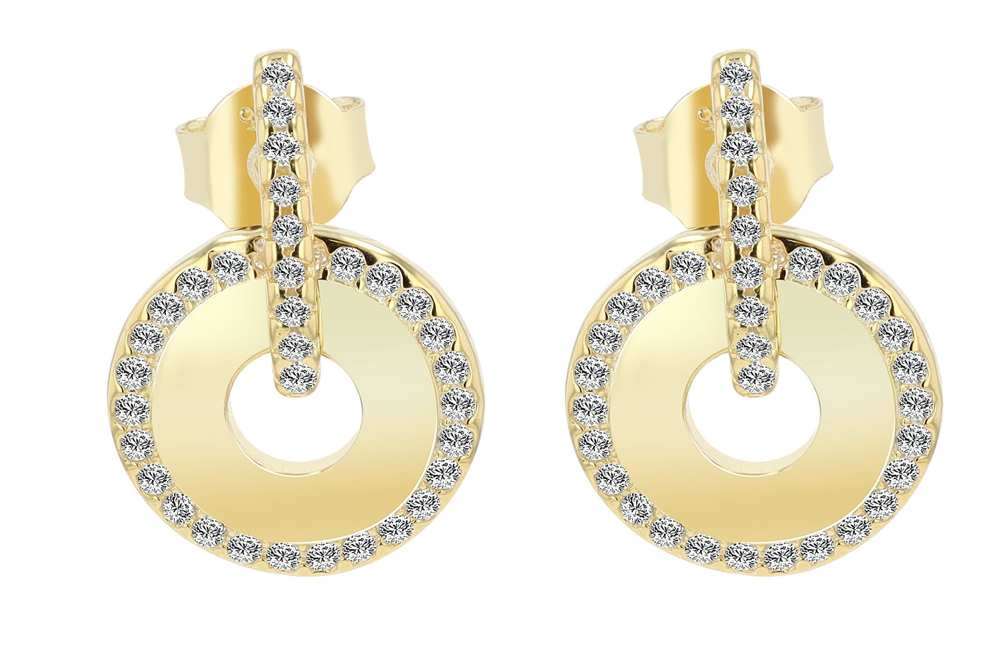 De oorstekers van gerhodineerd of verguld 925 Sterling zilver hebben elegante ronde hangers. Elke oorbel is bezet met 34 fonkelende zirkonia steentjes, die de oorsieraden subtiele elegantie en tijdloze schoonheid geven. De praktische vleugelsluiting zorgt niet alleen voor een stevige grip, maar rondt het ontwerp van deze oorbellen ook perfect af. Een eenvoudig maar glamoureus accessoire voor een stijlvolle uitstraling.