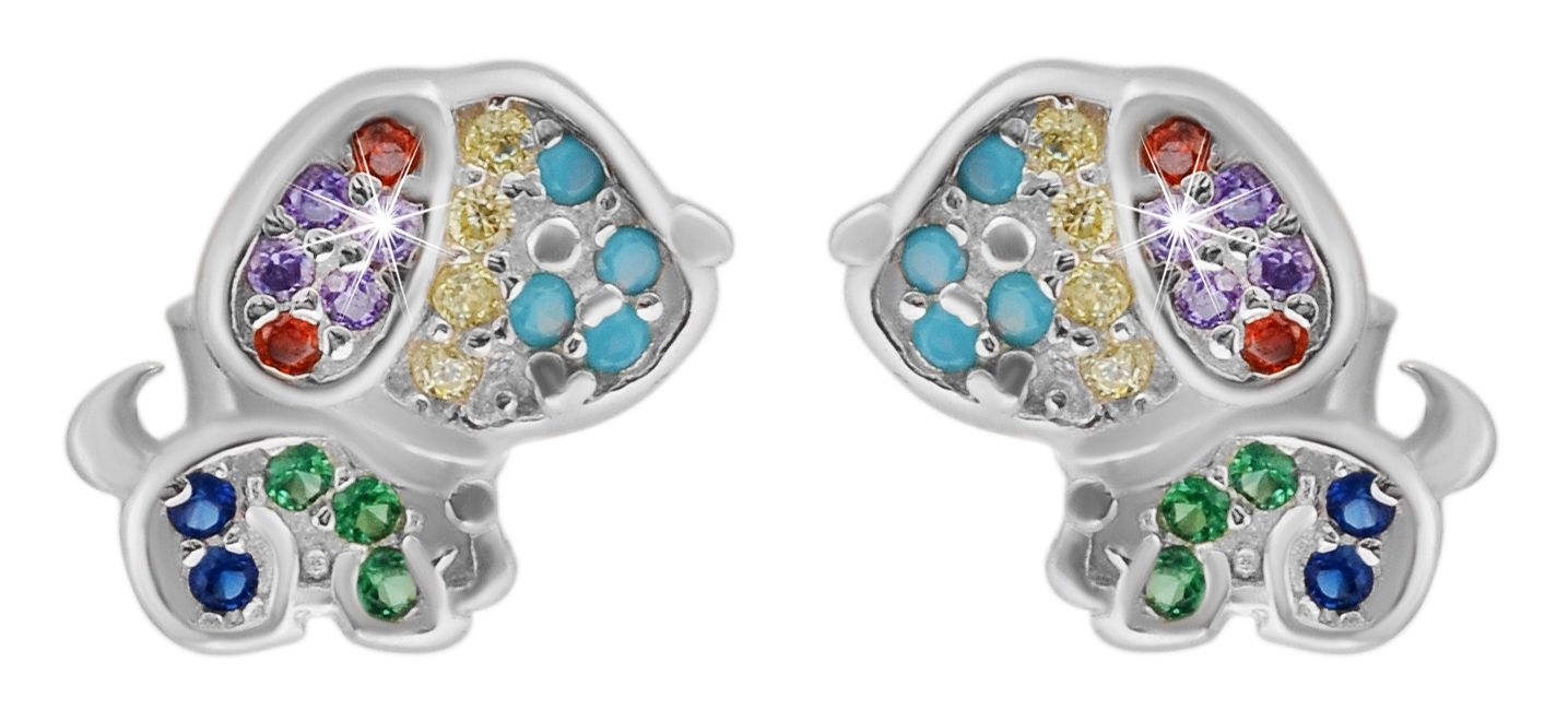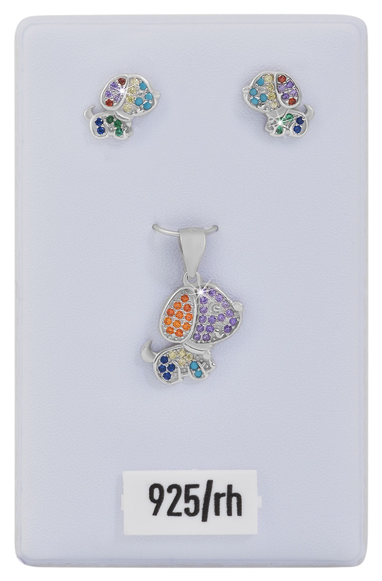 De kinder- en damessieradenset met een hondje en kleurrijke steentjes bestaat uit een hanger en oorstekers, met 82 kleurrijke zirkonia steentjes. Het is gemaakt van 925 zilver/gerhodineerd met bescherming tegen aanslag. De set heeft de volgende afmetingen Hanger: lengte: 15 mm, breedte: 13 mm, dikte 1,5 mm, oorstekers: lengte: 9 mm, breedte: 8 mm, dikte: 1 mm en een gewicht van 2 gram.