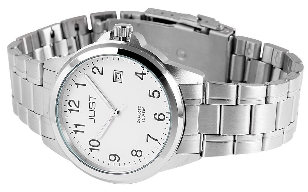 Het analoge herenpolshorloge met 3 wijzers van het merk Just heeft een hoogwaardig Miyota 2115 kwartsuurwerk. De zilverkleurige roestvrijstalen armband is 18 mm breed bij de lug en kan worden geopend en gesloten met een zilverkleurige roestvrijstalen vouwsluiting. De totale lengte van het horloge is 23 cm. De zilverkleurige roestvrijstalen kast met mineraalglas heeft een diameter van 38 mm en een kasthoogte van 11 mm. De achterkant van de kast is ook van roestvrij staal. Het horloge heeft een datumweergave op drie uur. De wijzerplaat is wit en de wijzers en cijfers zijn zwart. De wijzers zijn voorzien van Superluminova, waardoor je de tijd zelfs in het donker gemakkelijk kunt aflezen. Het horloge heeft een waterdichtheid van 10 bar. Je ontvangt een garantiekaart en een originele doos van het merk Just als accessoires voor je product.