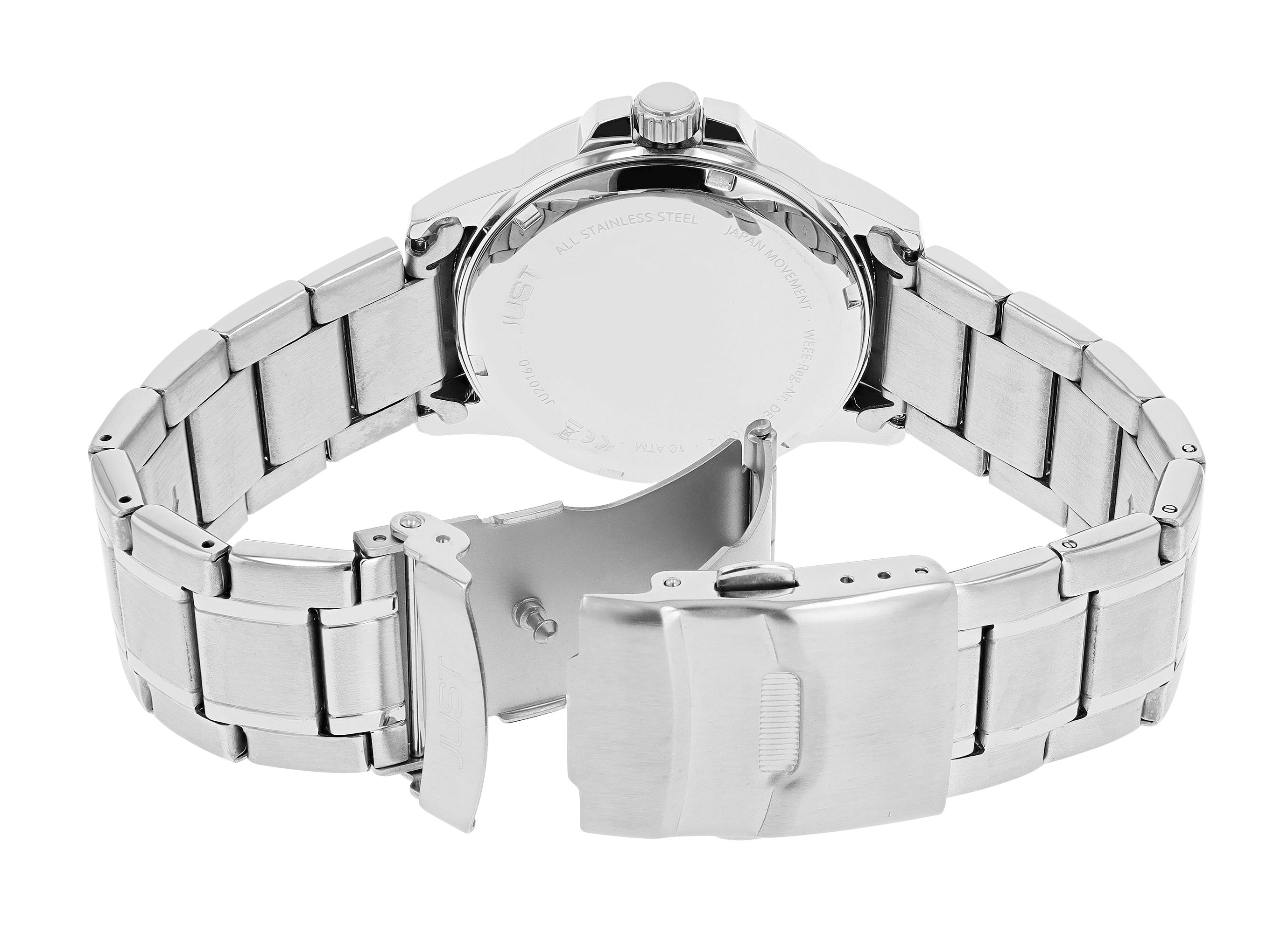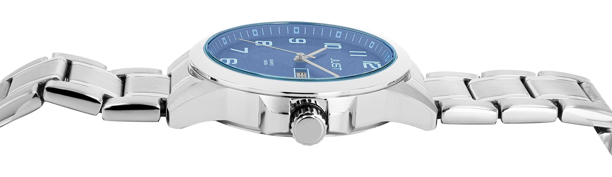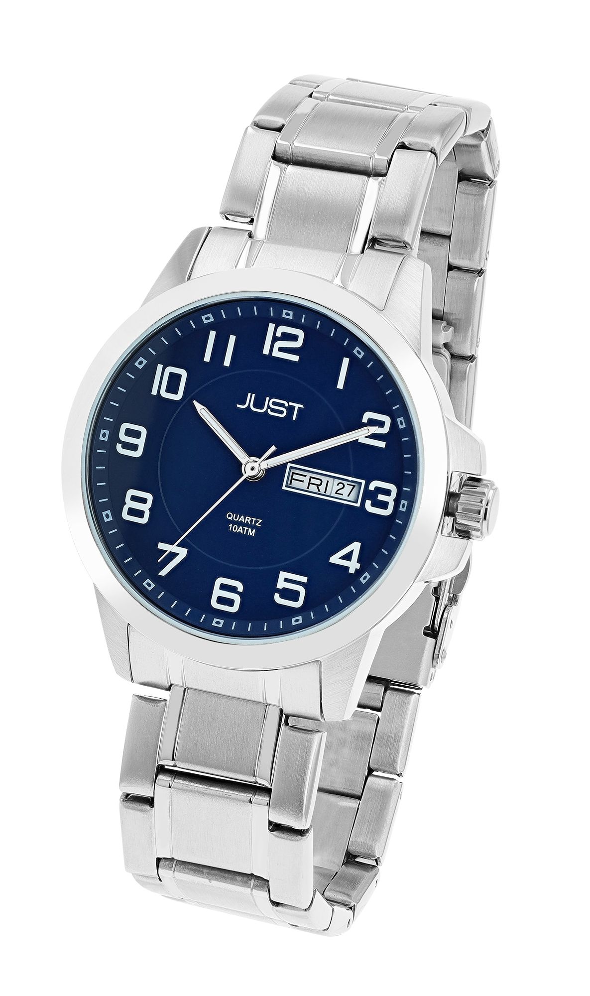 Productinformatie "Just herenhorloge met roestvrijstalen armband, 10 ATM, zilverkleurige/blauwe wijzerplaat"