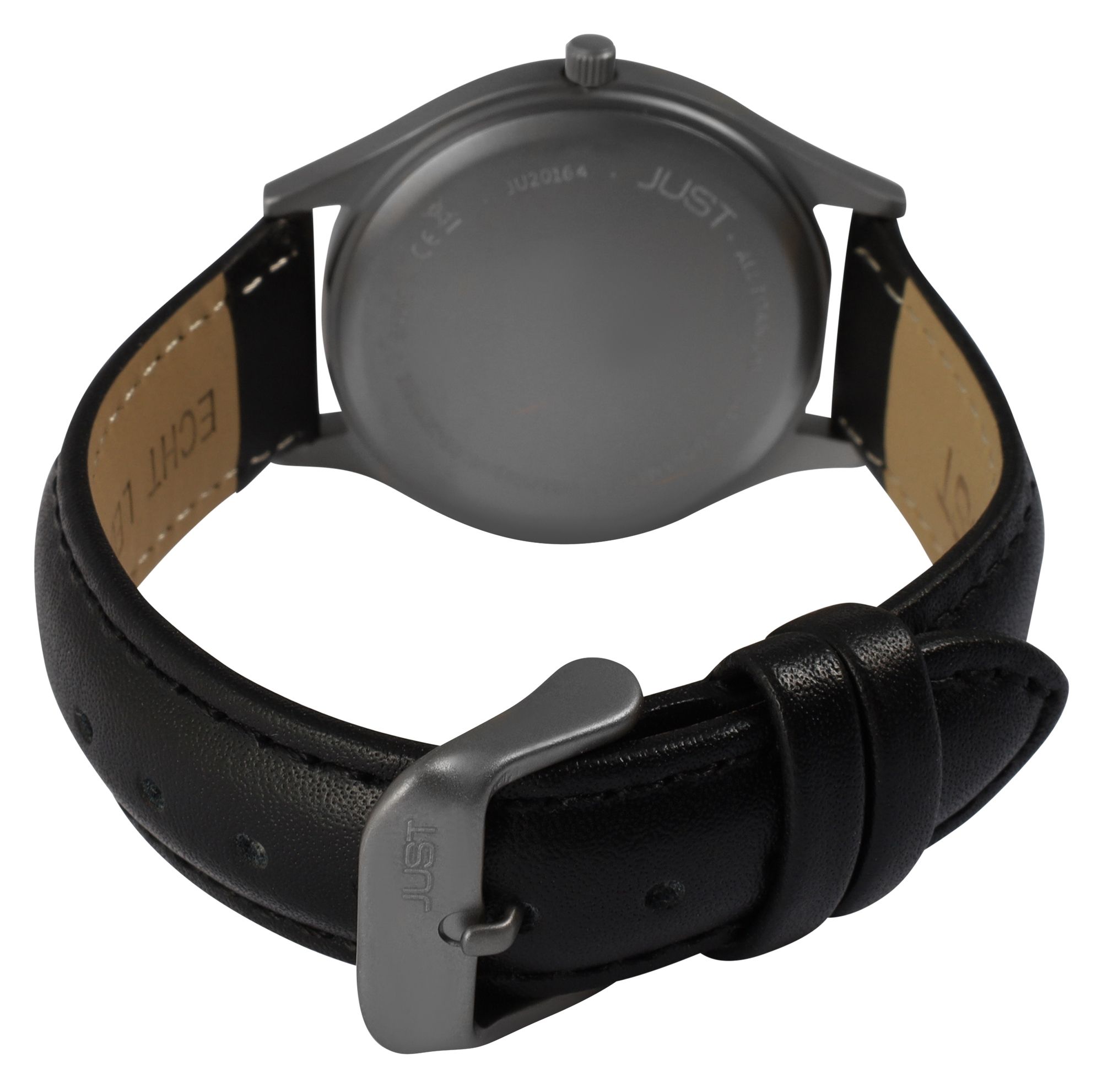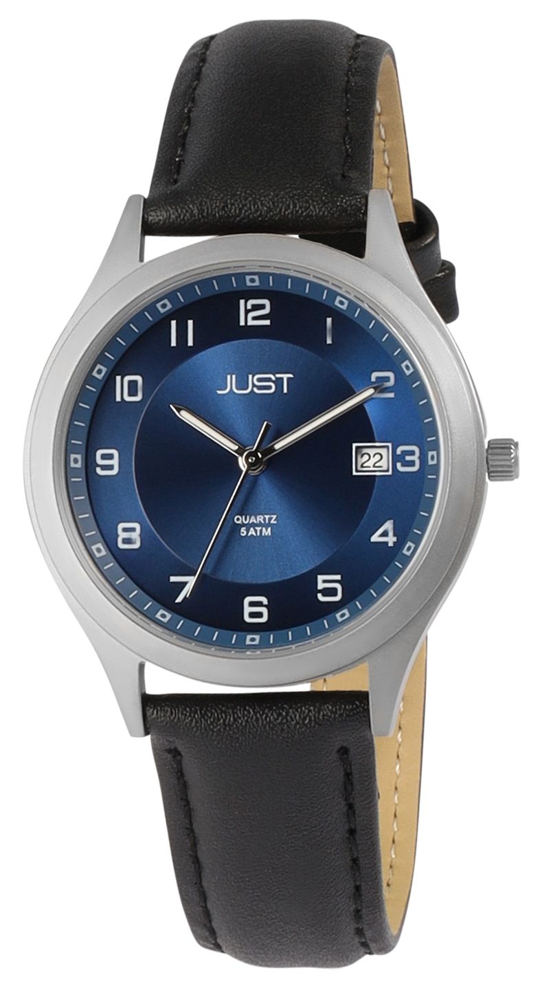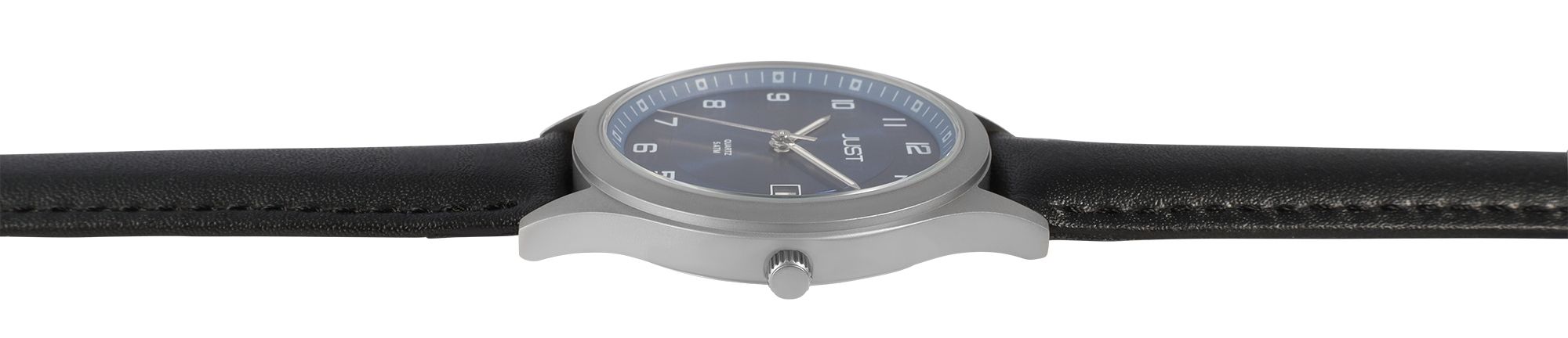 Productinformatie "Just "Leon" herenhorloge met echt lederen band, titanium kast, 5ATM, zwart/blauw"