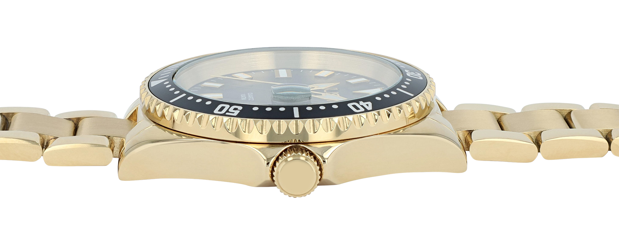 De roestvrijstalen kast heeft een diameter van 43 mm, een hoogte van 12 mm en wordt gecompleteerd door een lunette met schaalverdeling.