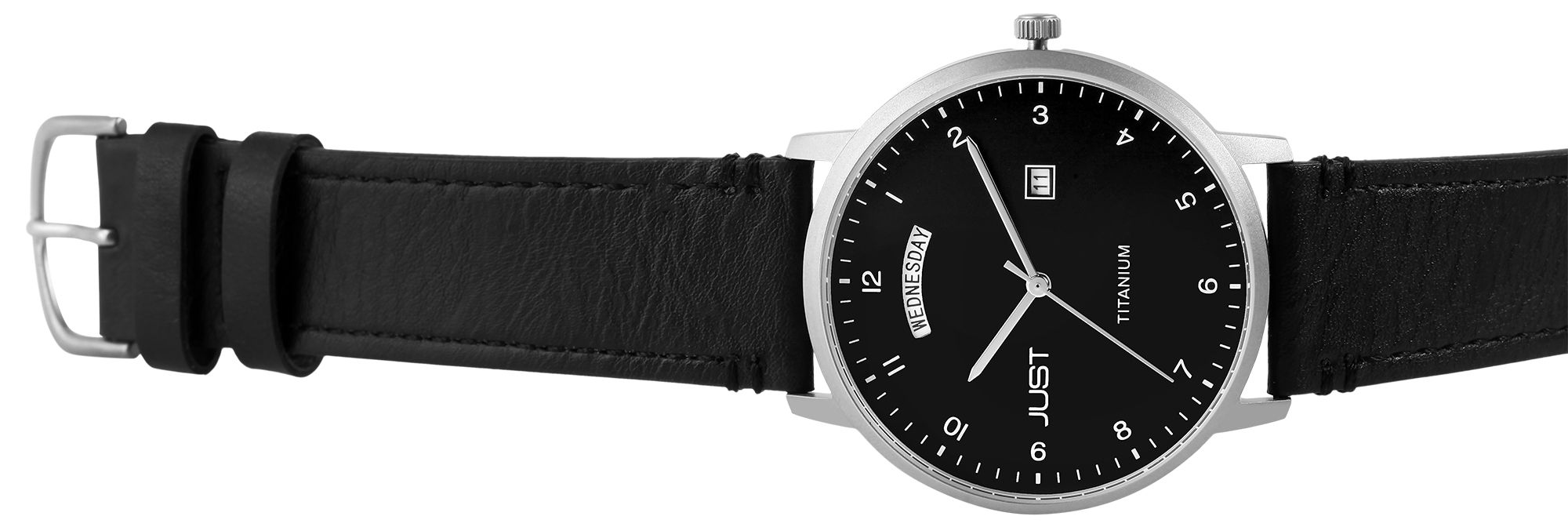 Het analoge herenpolshorloge met 3 wijzers van het merk Just heeft een hoogwaardig kwartsuurwerk. De band is gemaakt van echt leer en heeft een breedte van 22 mm. Het wordt geopend en gesloten met een titanium gesp. De totale lengte van het horloge is 25 cm. De ronde titanium kast met mineraalglas heeft een diameter van 43 mm en een kasthoogte van 8 mm. De achterkant van de kast is ook van titanium. Het horloge heeft ook een datum- en weekdagaanduiding en is waterbestendig tot 5 bar. Het contrast tussen de wijzerplaat en de indexen maakt het snel en gemakkelijk om de tijd af te lezen. De hoogwaardige en huidvriendelijke materialen maken het horloge ideaal voor mensen met allergieën.