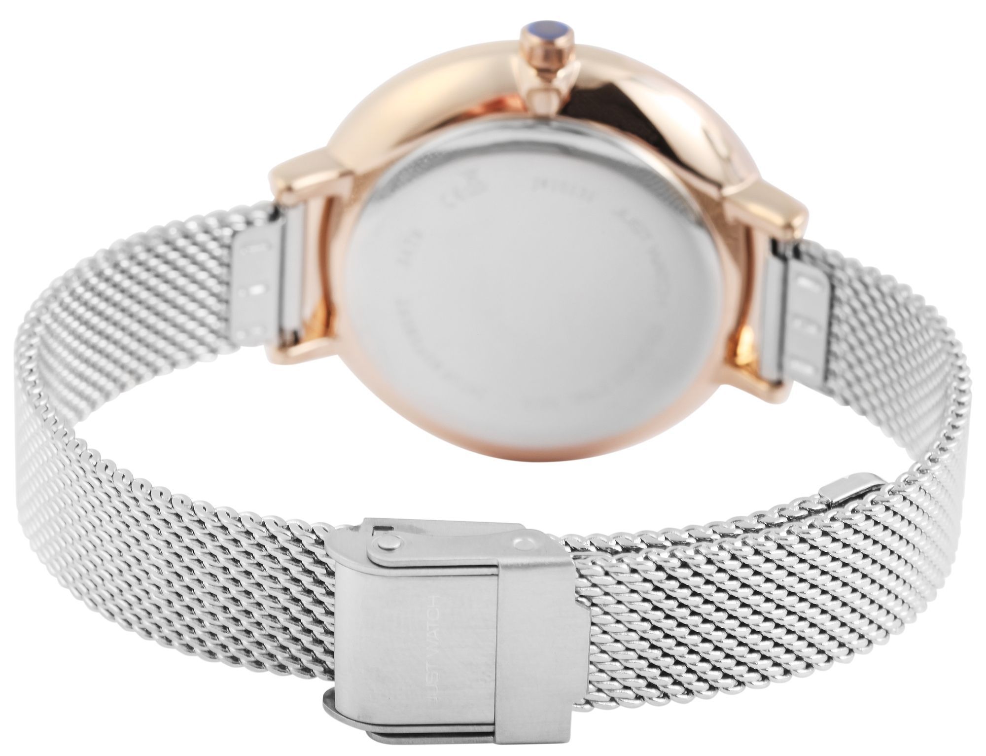 Het analoge 2-handige damespolshorloge van het merk Just Watch heeft een hoogwaardig quartz uurwerk. De zilverkleurige Milanese band heeft een lugbreedte van 12 mm en kan worden geopend en gesloten met een zilverkleurige roestvrijstalen haaksluiting. De totale lengte van het horloge is 21,5 cm. De roségoudkleurige metalen kast met mineraalglas heeft een diameter van 35 mm en een kasthoogte van 8 mm. De achterkant van de kast is gemaakt van roestvrijstaal en het horloge heeft een waterdichtheid van 3 bar. De wijzerplaat is zilverkleurig en de wijzers hebben dezelfde kleur als de kast en passen goed bij de algehele look van het horloge. Je ontvangt een originele doos en een garantiekaart als accessoires voor je product.