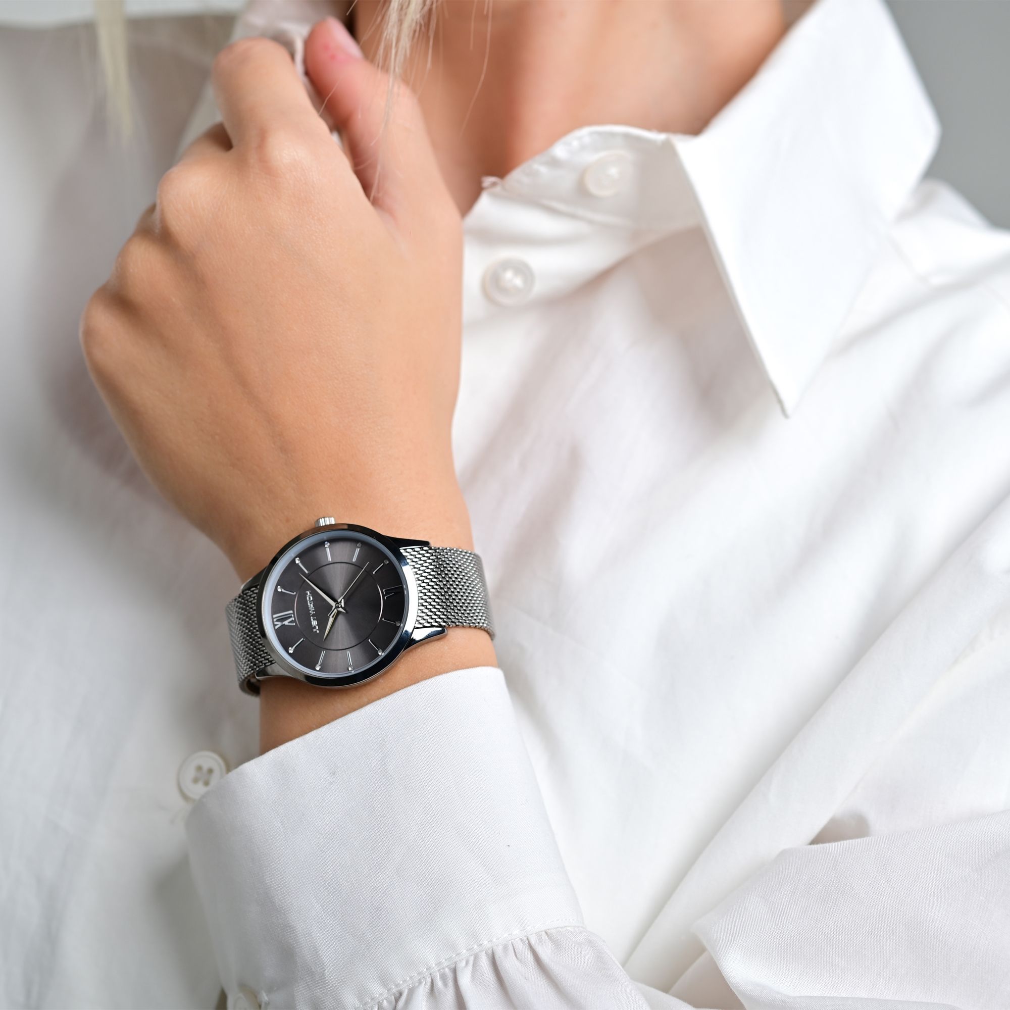 Het analoge 3-hands damespolshorloge van het merk Just Wach heeft een hoogwaardig quartz uurwerk. De antracietkleurige Milanese band is gemaakt van roestvrij staal en heeft een lugbreedte van 18 mm. Het klassieke polshorloge kan worden geopend en gesloten met een roestvrijstalen haaksluiting inclusief veiligheidspal. De totale lengte van het horloge is 21 cm. De antracietkleurige metalen kast met mineraalglas heeft een diameter van 36 mm en een kasthoogte van 8 mm. De achterkant van de kast is gemaakt van roestvrij staal en het horloge heeft een waterdichtheid van 3 bar. De lay-out van de wijzerplaat is eenvoudig gehouden en heeft zilverkleurige staafindexen. Deze zijn bovendien versierd met fijne Similis-steentjes. De wijzers hebben dezelfde kleur als de kast, wat het harmonieuze totaalbeeld van het horloge compleet maakt. Je ontvangt een garantiekaart en een originele Just Watch doos als accessoires voor je product.