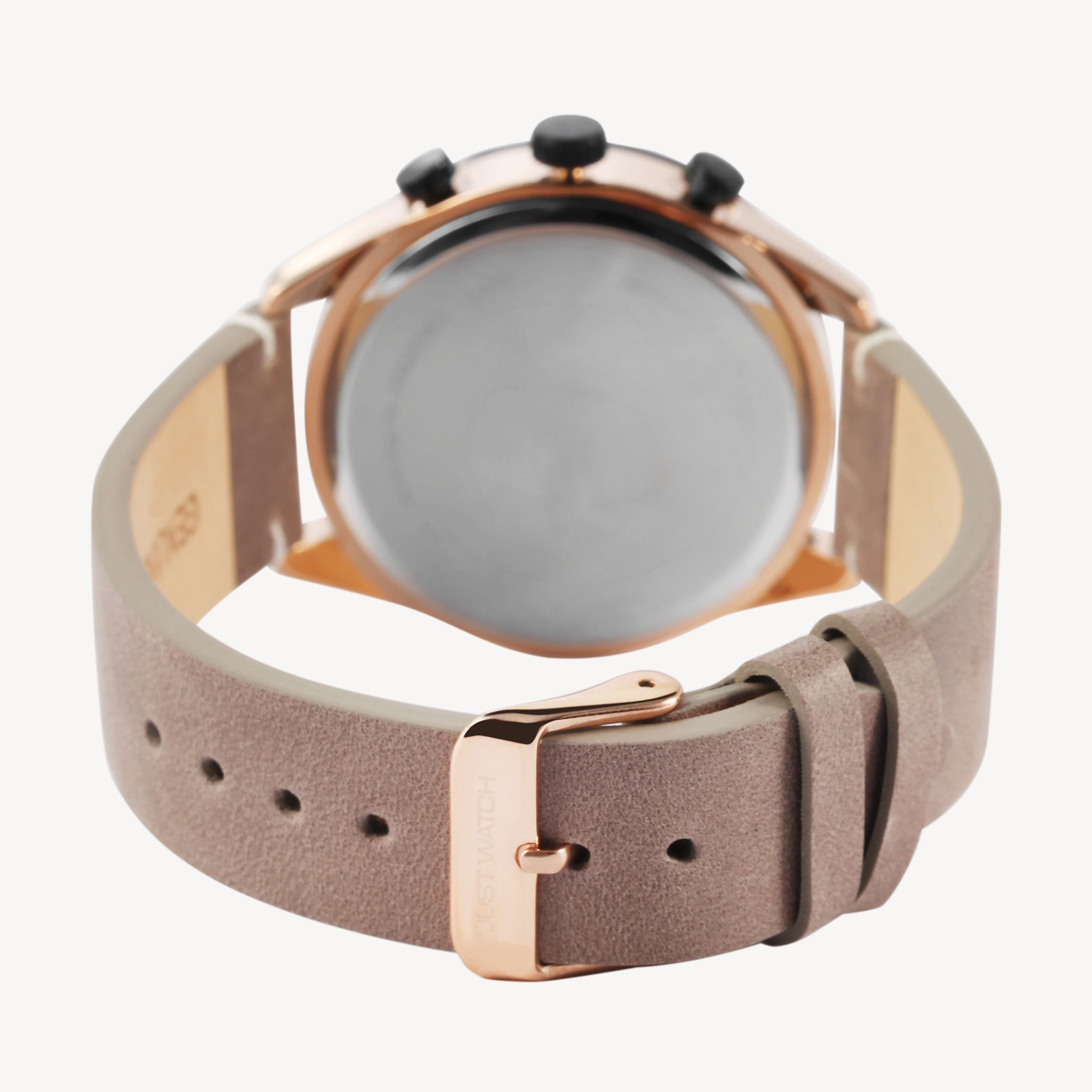 De herenchronograaf van het merk Just Watch heeft een hoogwaardig Japans VD35-kwartsuurwerk. De taupekleurige band van echt leer is 20 mm breed bij de lug en kan worden geopend en gesloten met een roségoudkleurige roestvrijstalen gesp. De totale lengte van het horloge is 25 cm. De roségoudkleurige metalen kast met mineraalglas heeft een diameter van 41 mm en een kasthoogte van 11 mm. De achterkant van de kast is gemaakt van roestvrij staal. De chronograaf kan worden gebruikt om de tijd stil te zetten, die vervolgens kan worden afgelezen op de drie totalisators op drie, zes en negen uur. Het horloge heeft ook een datumweergave tussen vier en vijf uur. De Superluminova wijzers en indexen maken het gemakkelijk om de tijd af te lezen, zelfs in het donker. Het herenhorloge heeft ook een waterdichtheid van 3 bar. Al met al is dit horloge een sportief uurwerk en een geweldige metgezel voor dagelijks gebruik.
