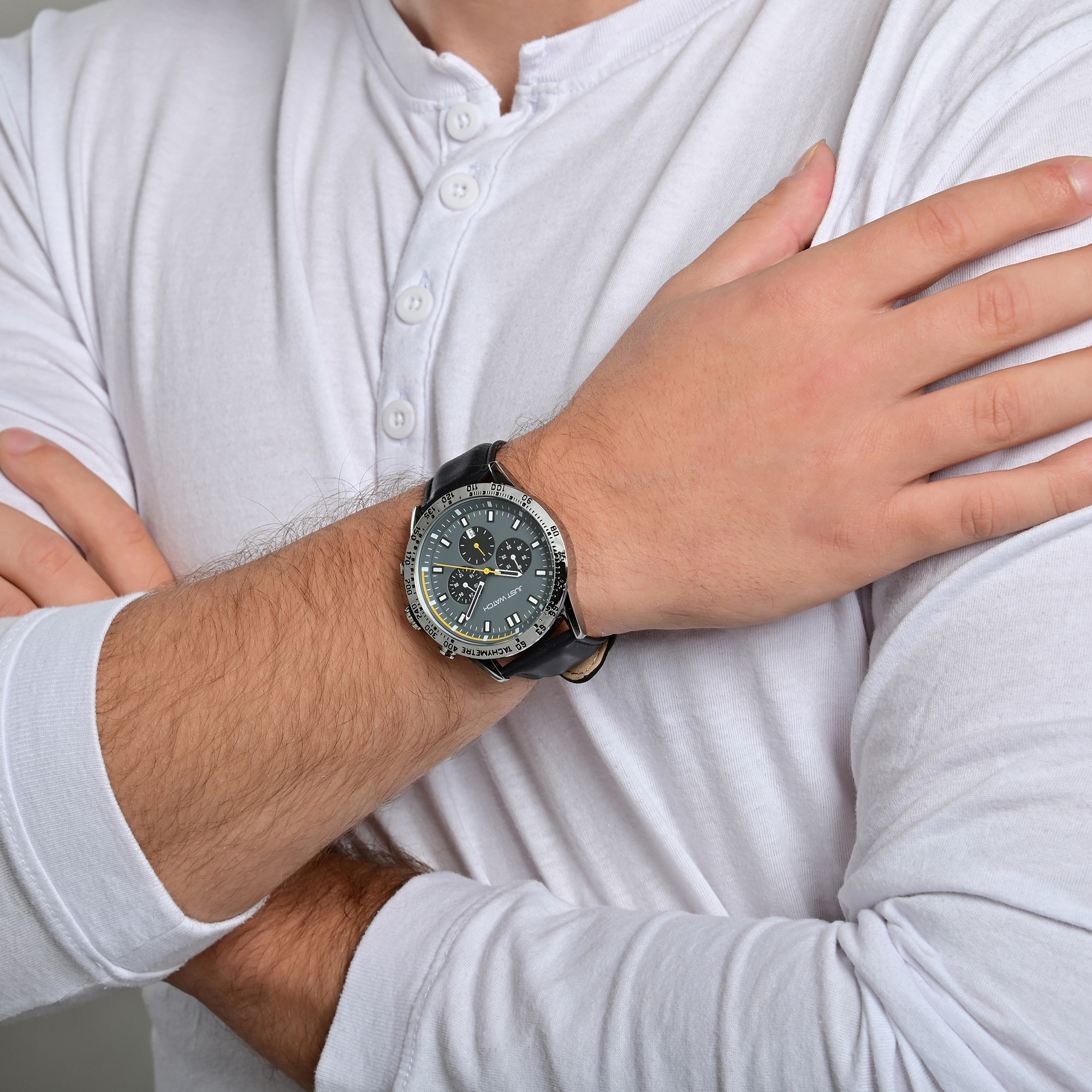 Ontdek de symbiose van elegantie, functionaliteit en individualiteit met onze Just Watch herenchronograaf met leren band en laat je inspireren door de precisie en schoonheid van dit uurwerk!