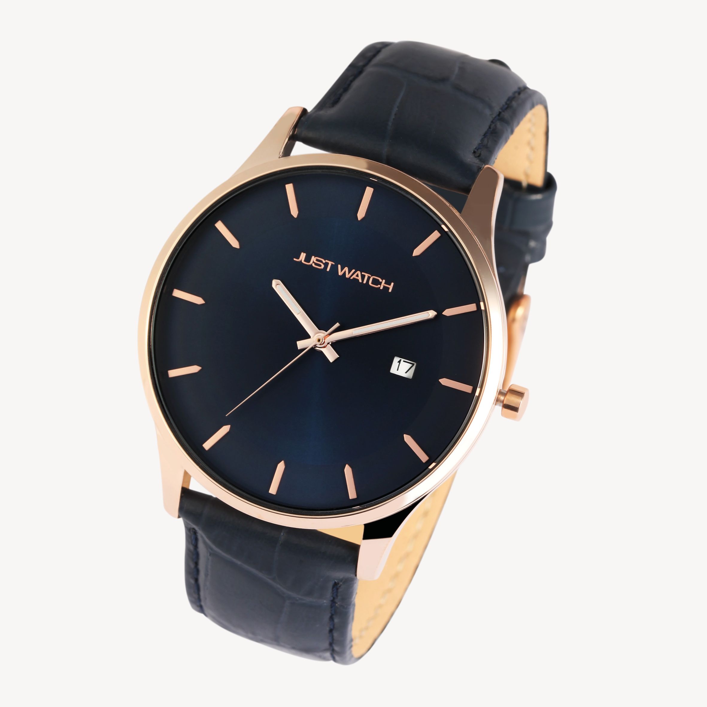 Productinformatie "Just Watch Herrenuhr mit Echtlederarmband, Datumsanzeige, blau/roségoldfarben"
