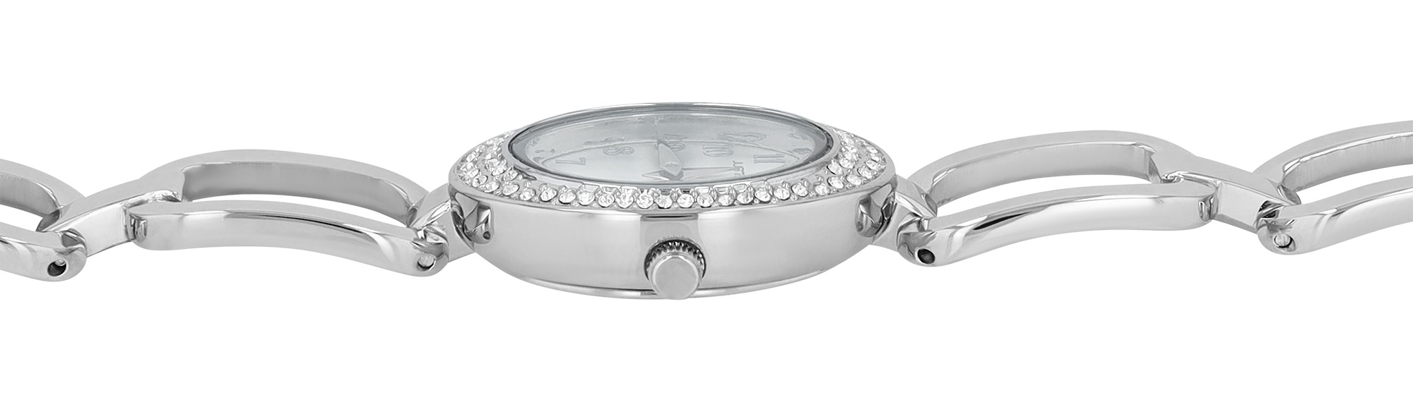 De ovale kast (29 x 22 x 8 mm) van metaal met een roestvrijstalen achterkant is rondom versierd met fonkelende simili-stenen en zorgt voor een stijlvolle uitstraling. De roestvrijstalen schakelarmband (14 mm breed, totale lengte 19,4 cm), met grove schakels aan de voorkant, benadrukt het elegante ontwerp en is ook zeer comfortabel om te dragen. Eenvoudig om- en afdoen met een veilige clipsluiting. Het horloge kan aan de pols worden aangepast door eenvoudig afzonderlijke elementen te verwijderen.