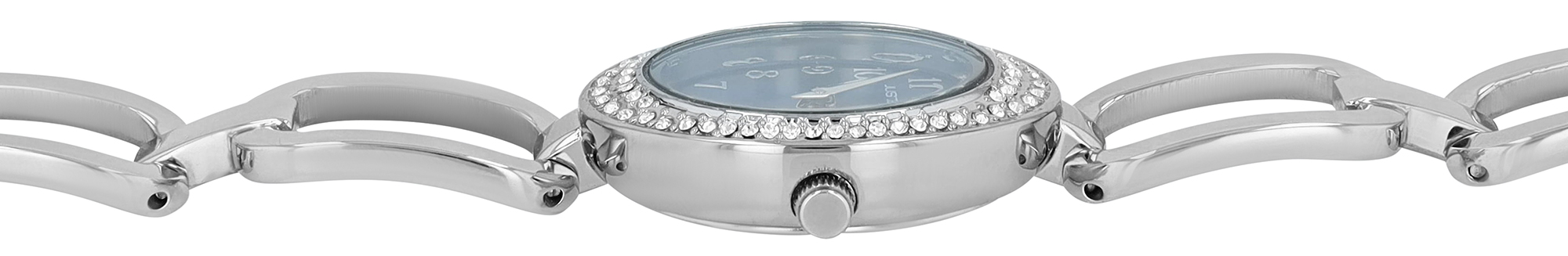 De ovale kast (29 x 22 x 8 mm) van metaal met een roestvrijstalen achterkant is rondom versierd met fonkelende simili-stenen en zorgt voor een stijlvolle uitstraling. De roestvrijstalen schakelarmband (14 mm breed, totale lengte 19,4 cm), met grove schakels aan de voorkant, benadrukt het elegante ontwerp en is ook zeer comfortabel om te dragen. Gemakkelijk om en af te doen met een veilige clipsluiting. Het horloge kan aan de pols worden aangepast door eenvoudig afzonderlijke elementen te verwijderen.