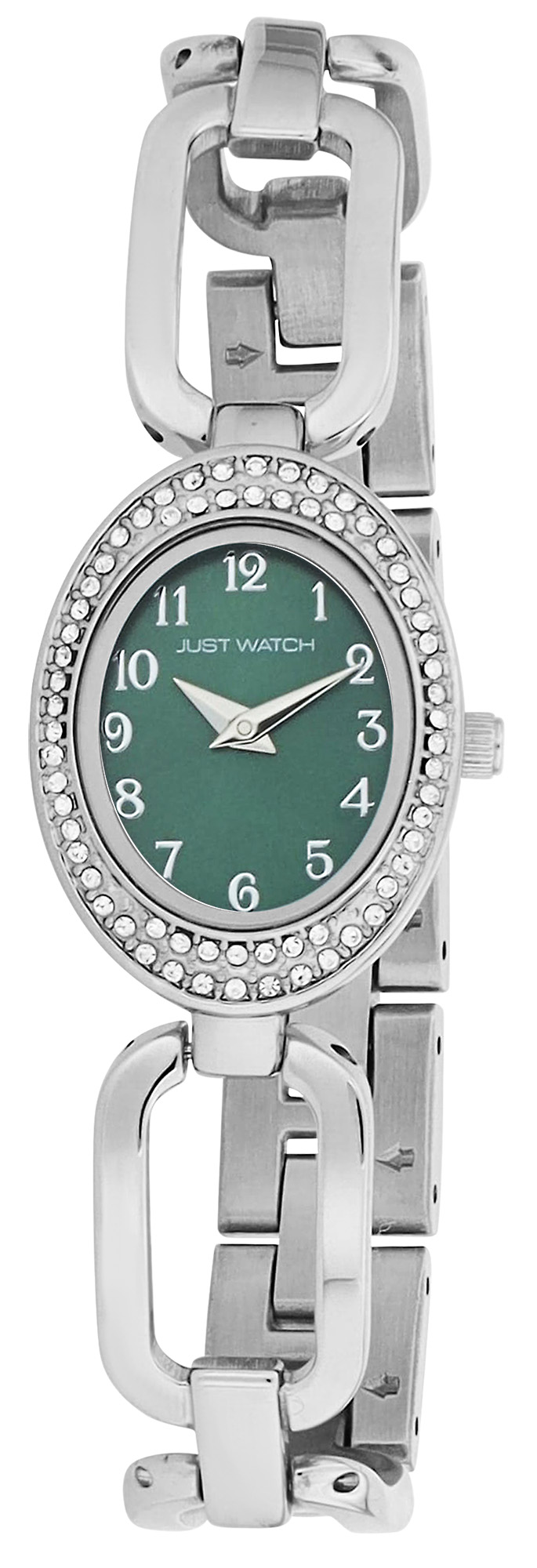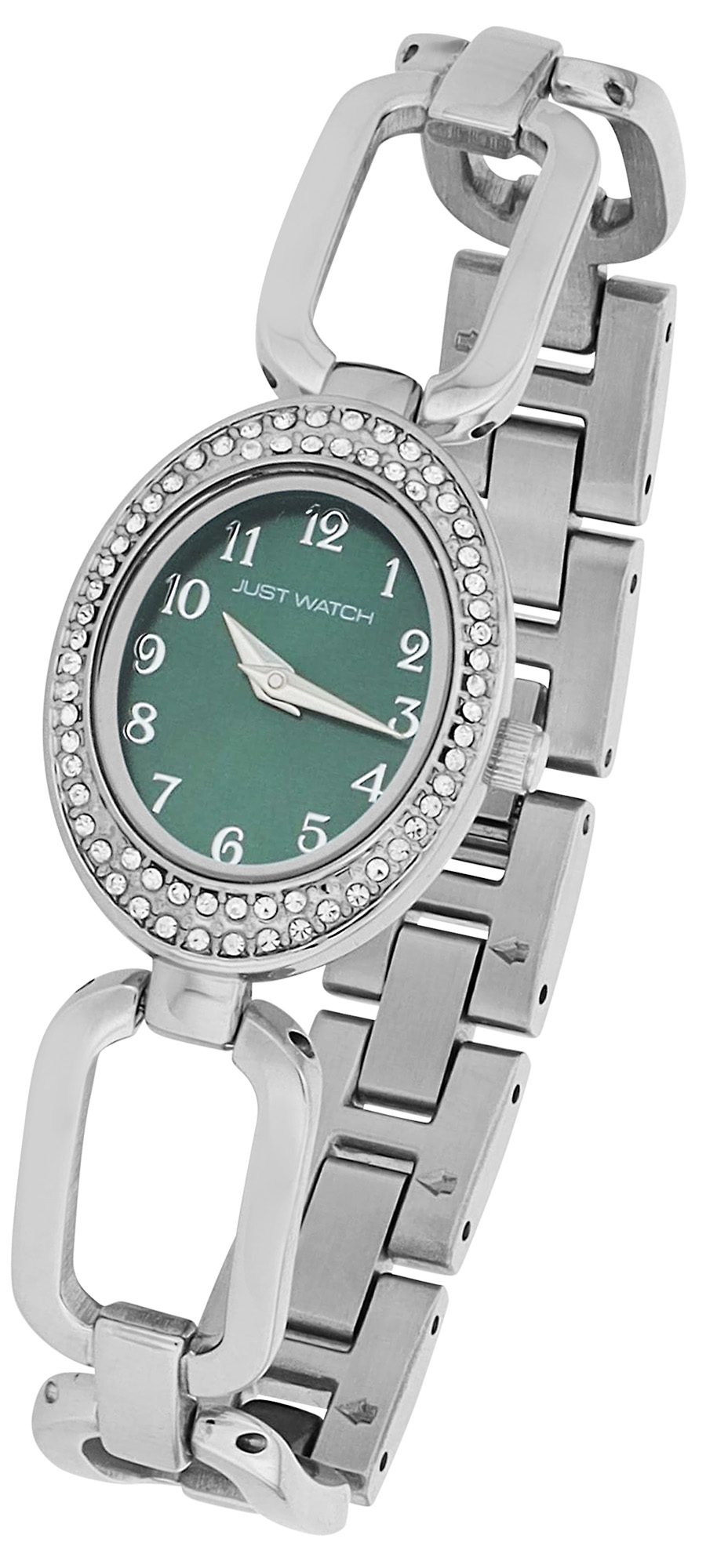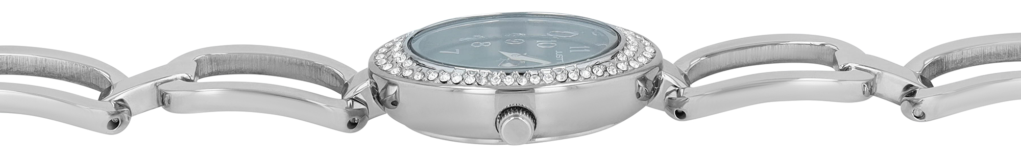 De ovale kast (29 x 22 x 8 mm) van metaal met een roestvrijstalen achterkant is rondom versierd met fonkelende simili-stenen en zorgt voor een stijlvolle uitstraling. De roestvrijstalen schakelarmband (14 mm breed, totale lengte 19,4 cm), met grove schakels aan de voorkant, benadrukt het elegante ontwerp en is ook zeer comfortabel om te dragen. Gemakkelijk om en af te doen met een veilige clipsluiting. Het horloge kan aan de pols worden aangepast door eenvoudig afzonderlijke elementen te verwijderen.