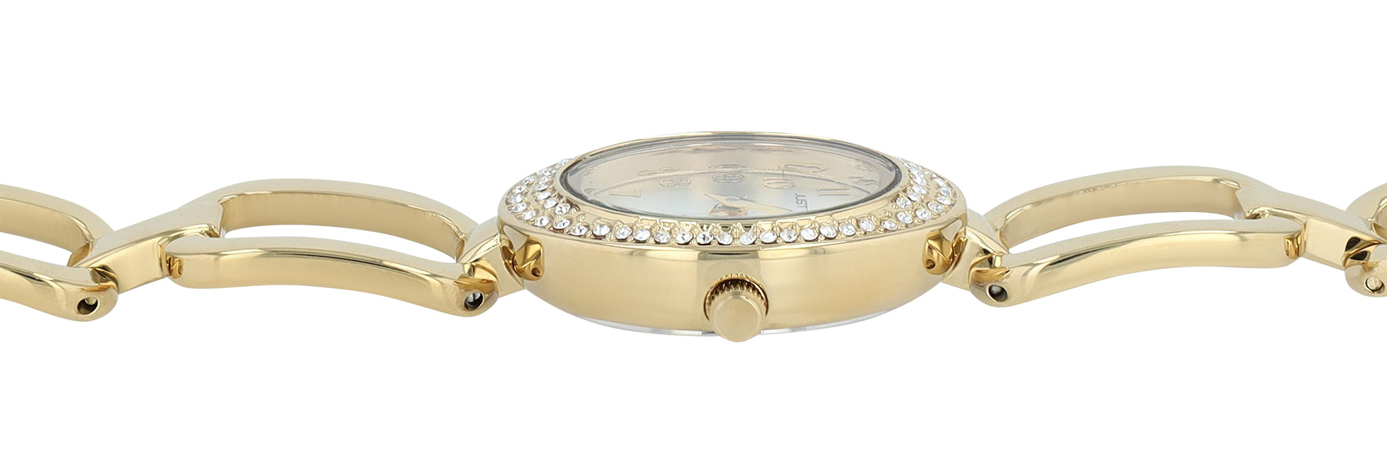 De ovale kast (29 x 22 x 8 mm) van metaal met een roestvrijstalen achterkant is rondom versierd met fonkelende simili-stenen en zorgt voor een stijlvolle uitstraling. De roestvrijstalen schakelarmband (14 mm breed, totale lengte 19,4 cm), met grove schakels aan de voorkant, benadrukt het elegante ontwerp en is ook zeer comfortabel om te dragen. Gemakkelijk om en af te doen met een veilige clipsluiting. Het horloge kan aan de pols worden aangepast door eenvoudig afzonderlijke elementen te verwijderen.