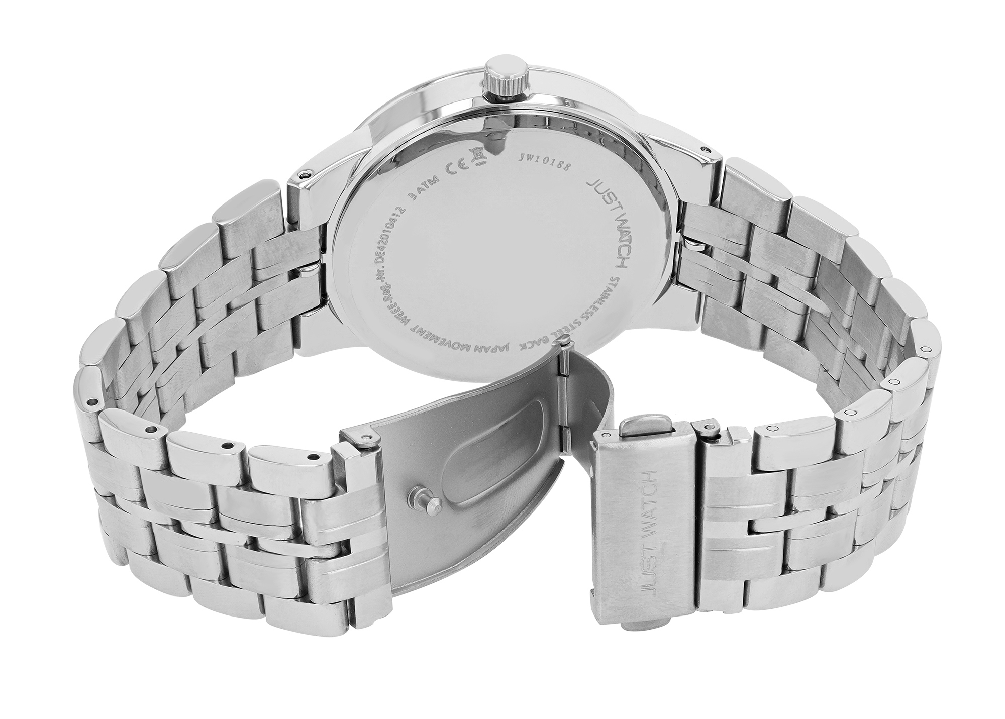 Het analoge unisex polshorloge met 3 wijzers van het merk Just Wach heeft een hoogwaardig kwartsuurwerk. De schakelarmband is gemaakt van roestvrij staal en heeft een lugbreedte van 24 mm. Het horloge kan worden geopend en gesloten met een roestvrijstalen vouwsluiting. De totale lengte van het horloge is 22 cm. De metalen kast met mineraalglas heeft een diameter van 42 mm en een kasthoogte van 10 mm. De achterkant van de kast is gemaakt van roestvrij staal en het horloge heeft een waterdichtheid van 3 bar. Het horloge heeft ook een datumaanduiding op drie uur. Je ontvangt een garantiekaart en een originele Just Watch doos als accessoires voor je product.