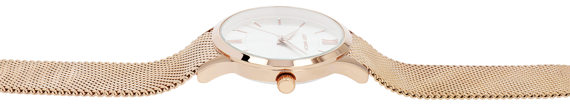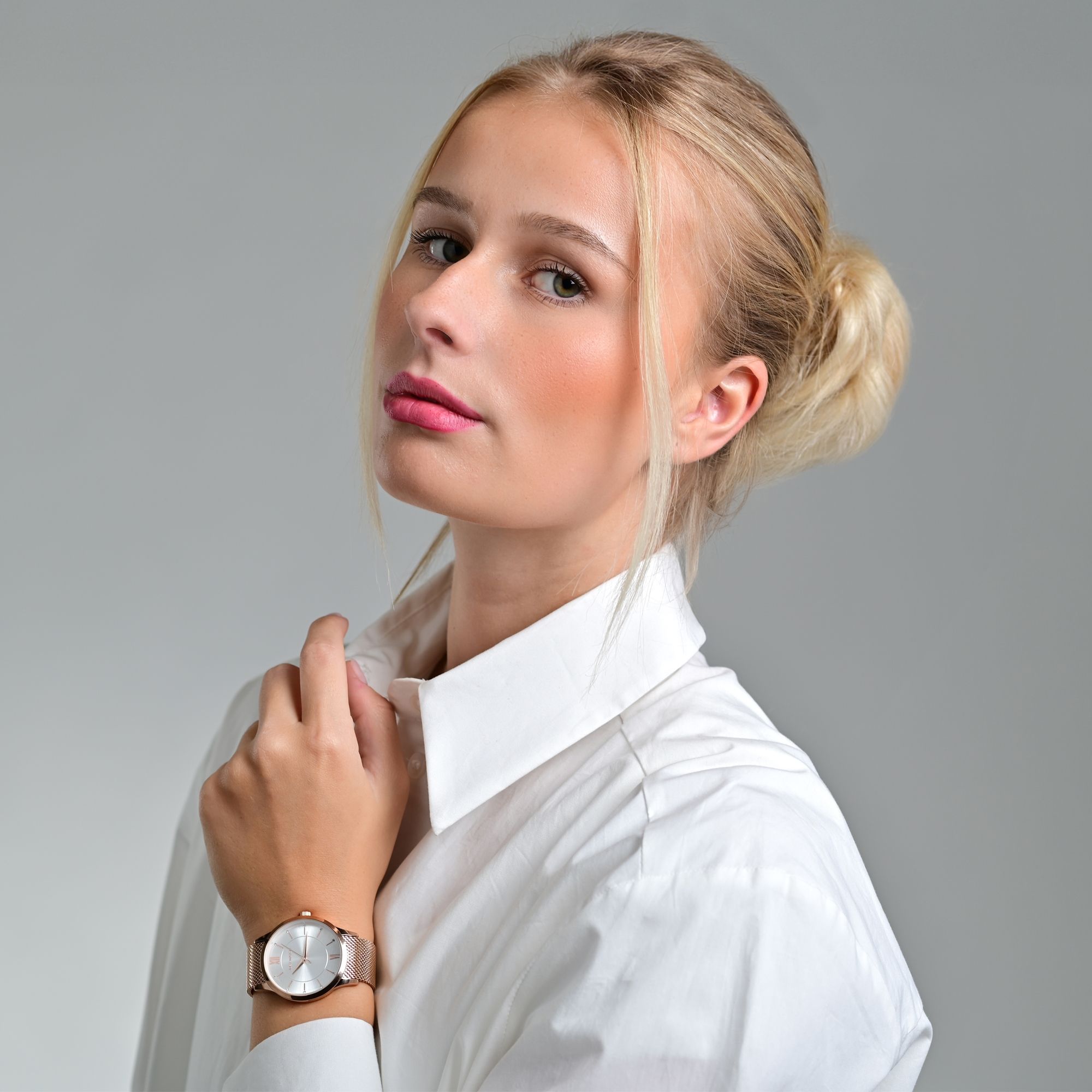 Het analoge 3-hands damespolshorloge van het merk Just Wach heeft een hoogwaardig quartz uurwerk. De roségoudkleurige Milanese band is gemaakt van roestvrij staal en heeft een lugbreedte van 18 mm. Het klassieke polshorloge kan worden geopend en gesloten met een roségoudkleurige roestvrijstalen haaksluiting inclusief veiligheidspal. De totale lengte van het horloge is 21 cm. De roségoudkleurige metalen kast met mineraalglas heeft een diameter van 36 mm en een kasthoogte van 8 mm. De achterkant van de kast is gemaakt van roestvrij staal en het horloge heeft een waterdichtheid van 3 bar. De lay-out van de wijzerplaat is eenvoudig gehouden en heeft roségoudkleurige staafindexen. Deze zijn bovendien versierd met fijne Similis-steentjes. De wijzers hebben dezelfde kleur als de kast, wat het harmonieuze totaalbeeld van het horloge compleet maakt. Je ontvangt een garantiekaart en een originele Just Watch doos als accessoires voor je product.