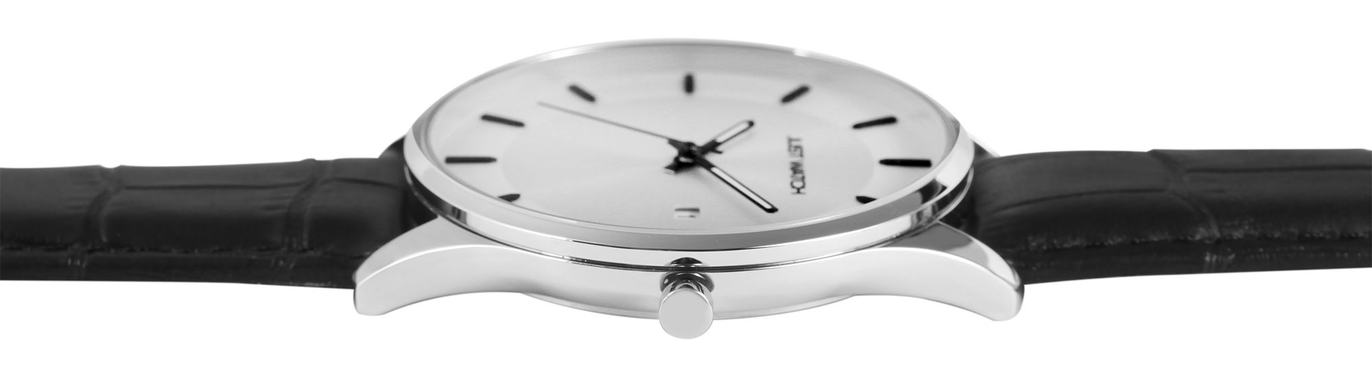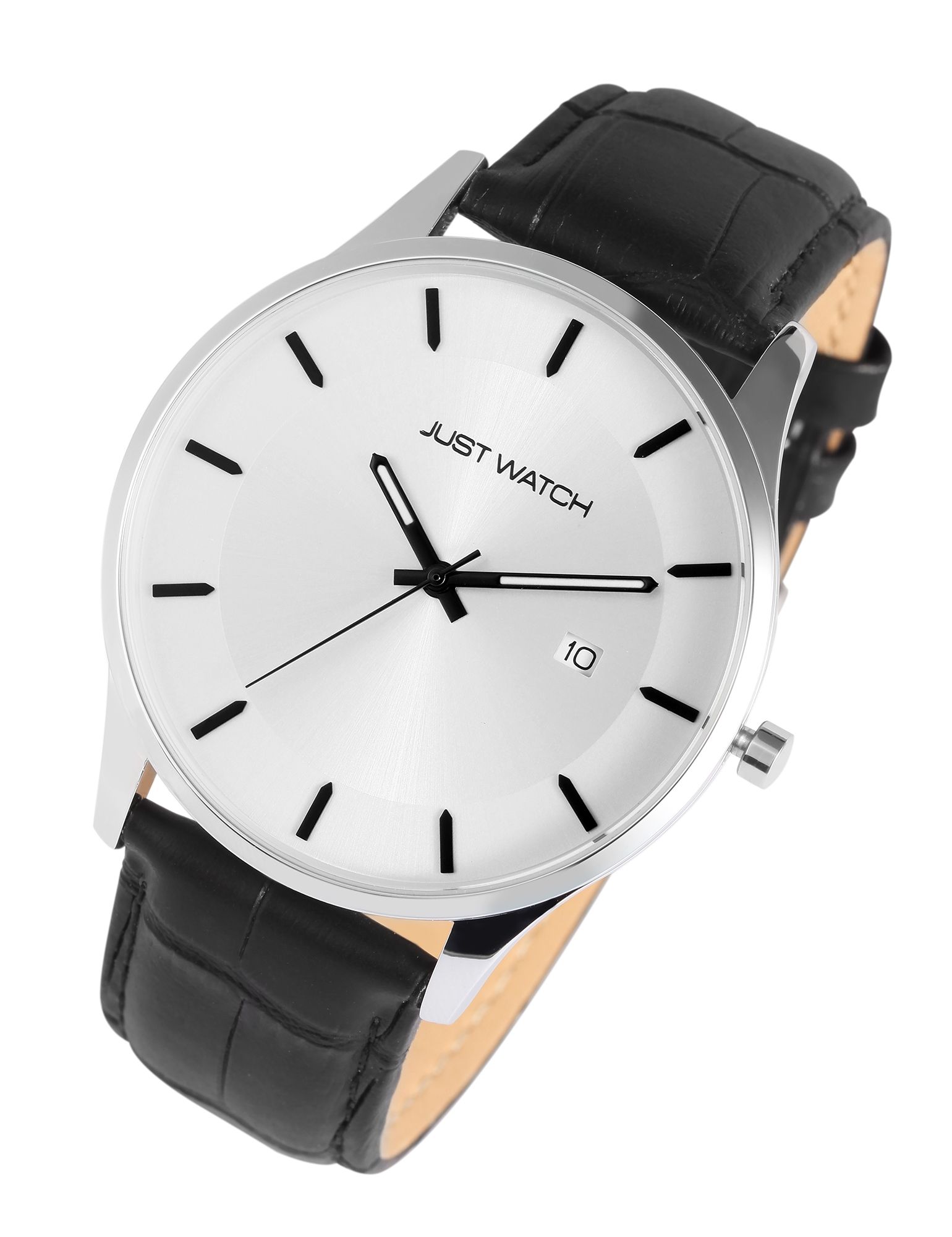 Productinformatie "Just Watch herenhorloge met echt lederen band, datumaanduiding, zwart/zilverkleurig"