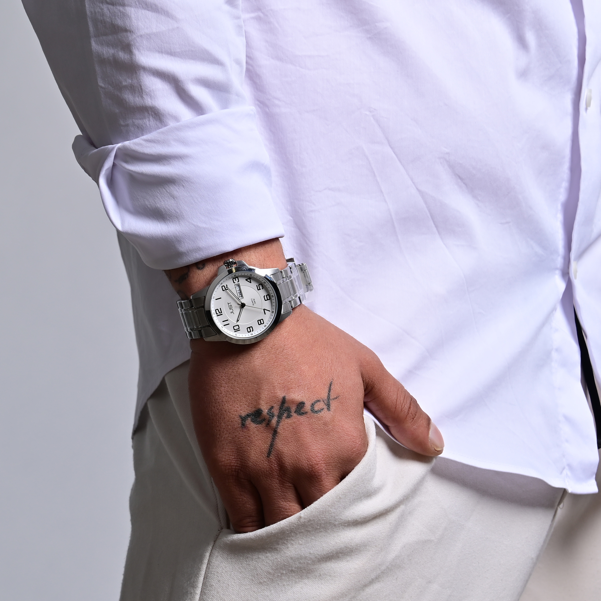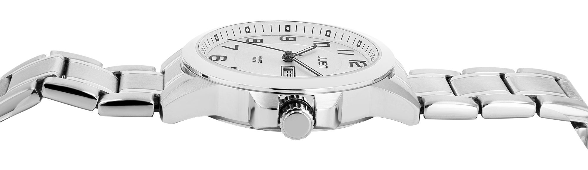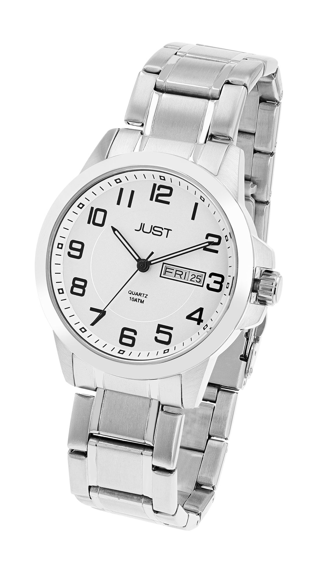 Productinformatie "Just herenhorloge met roestvrijstalen armband, 10 ATM, zilverkleurige/witte wijzerplaat"