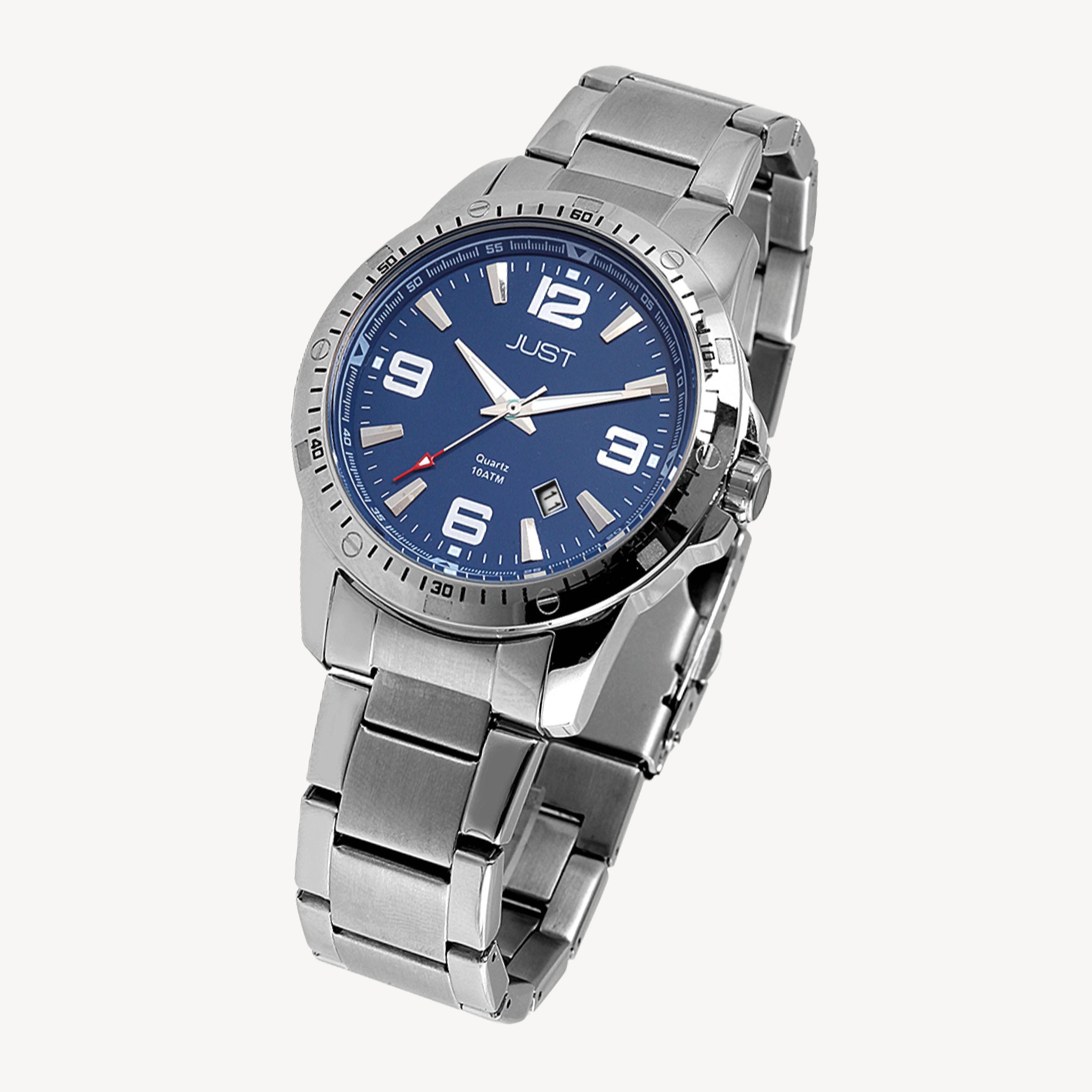Productinformatie "Just herenhorloge met roestvrijstalen armband, datumweergave, 10 bar, zilverkleurige/blauwe wijzerplaat"