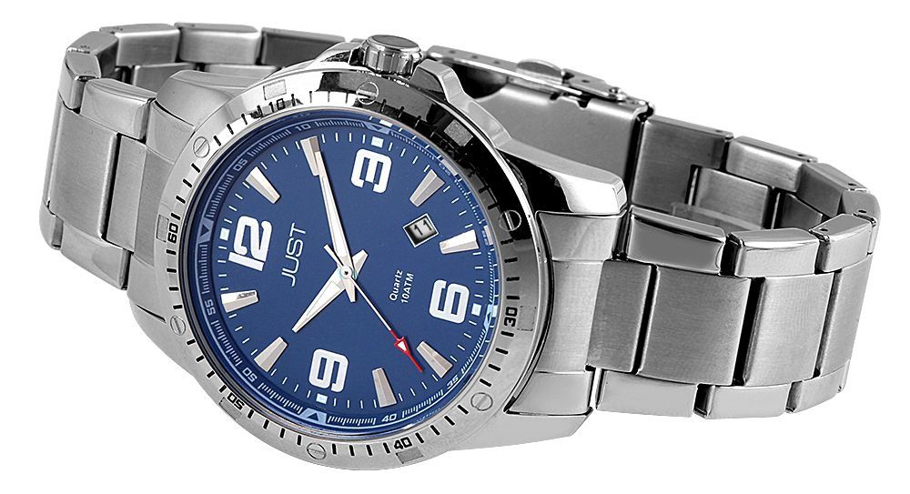Het analoge herenpolshorloge met 3 wijzers van het merk Just heeft een hoogwaardig en nauwkeurig Miyota kwartsuurwerk. De roestvrijstalen schakelarmband heeft zowel een matte als gepolijste afwerking en een lugbreedte van 22 mm. Hij kan worden geopend en gesloten met een roestvrijstalen vouwsluiting. De totale lengte van het horloge is 24 cm, maar dit kan worden aangepast aan elke polsmaat met behulp van een geschikt hulpmiddel dankzij de verwijderbare elementen. De ronde roestvrijstalen kast met mineraalglas heeft een diameter van 43 mm en een kasthoogte van 11 mm. De wijzerplaat is overzichtelijk, met grote Arabische cijfers en staafindexen voor het eenvoudig en duidelijk aflezen van de huidige tijd. Het horloge heeft ook Superluminova-gecoate uur- en minutenwijzers die discreet oplichten in het donker. Het herenhorloge heeft ook een datumweergave tussen vier en vijf uur. De kastdeksel is gemaakt van roestvrij staal en de waterbestendigheid is 10 bar. Dit product wordt geleverd met een garantiekaart en een originele Just-doos als accessoires.