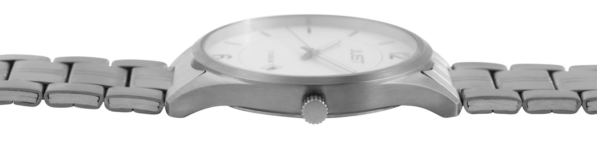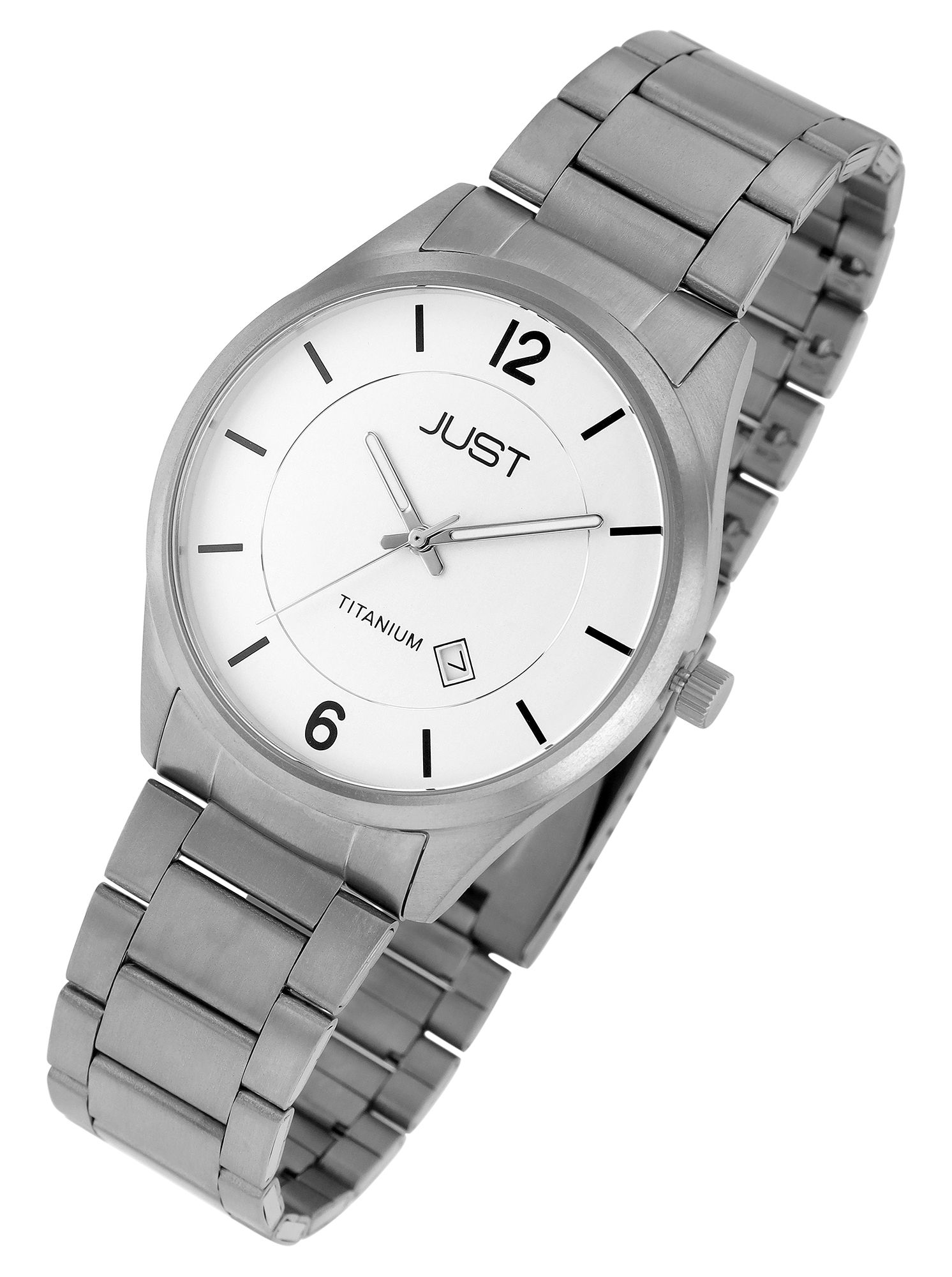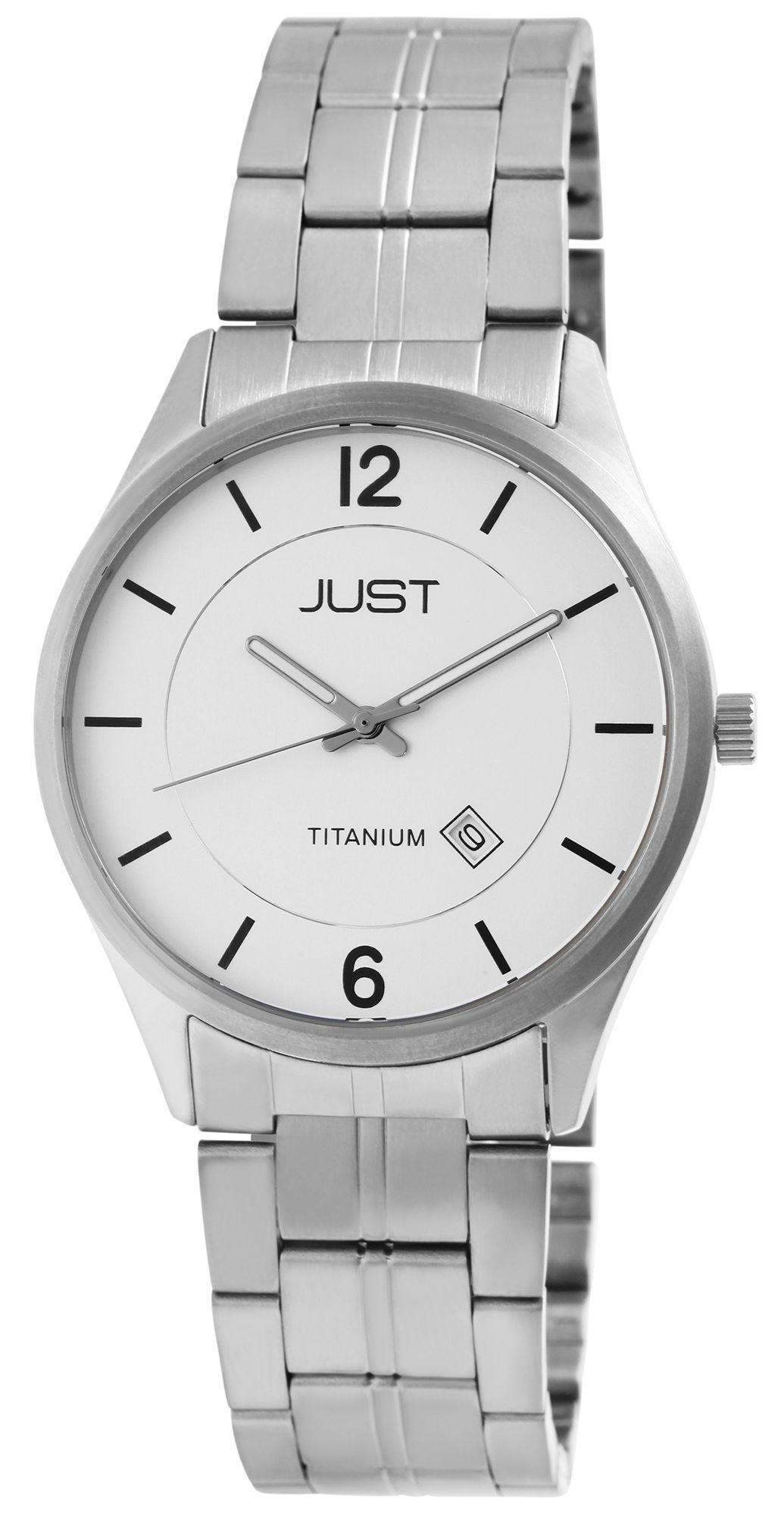 Productinformatie "Just herenhorloge met schakelarmband, titanium, 5 ATM, witte wijzerplaat"