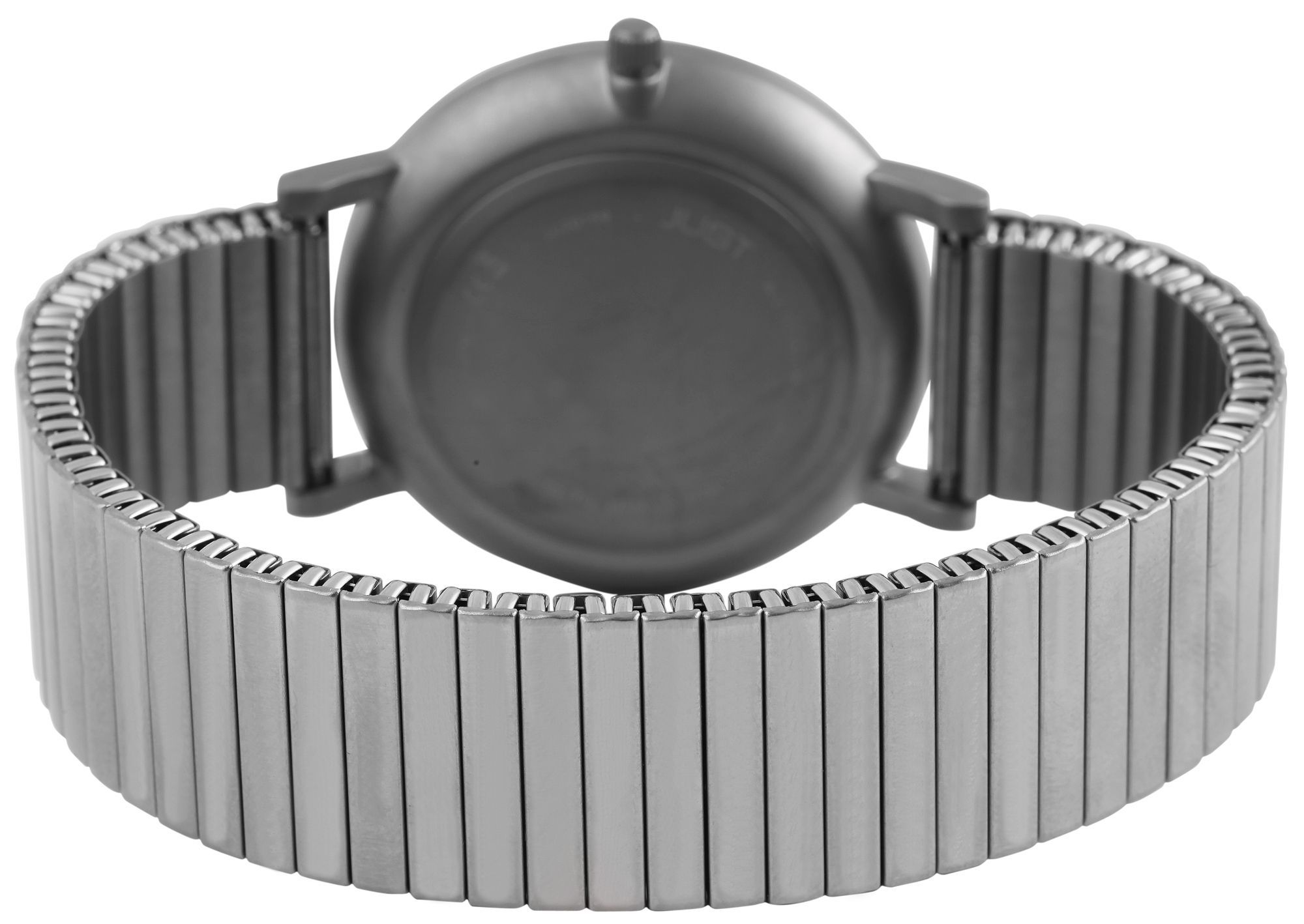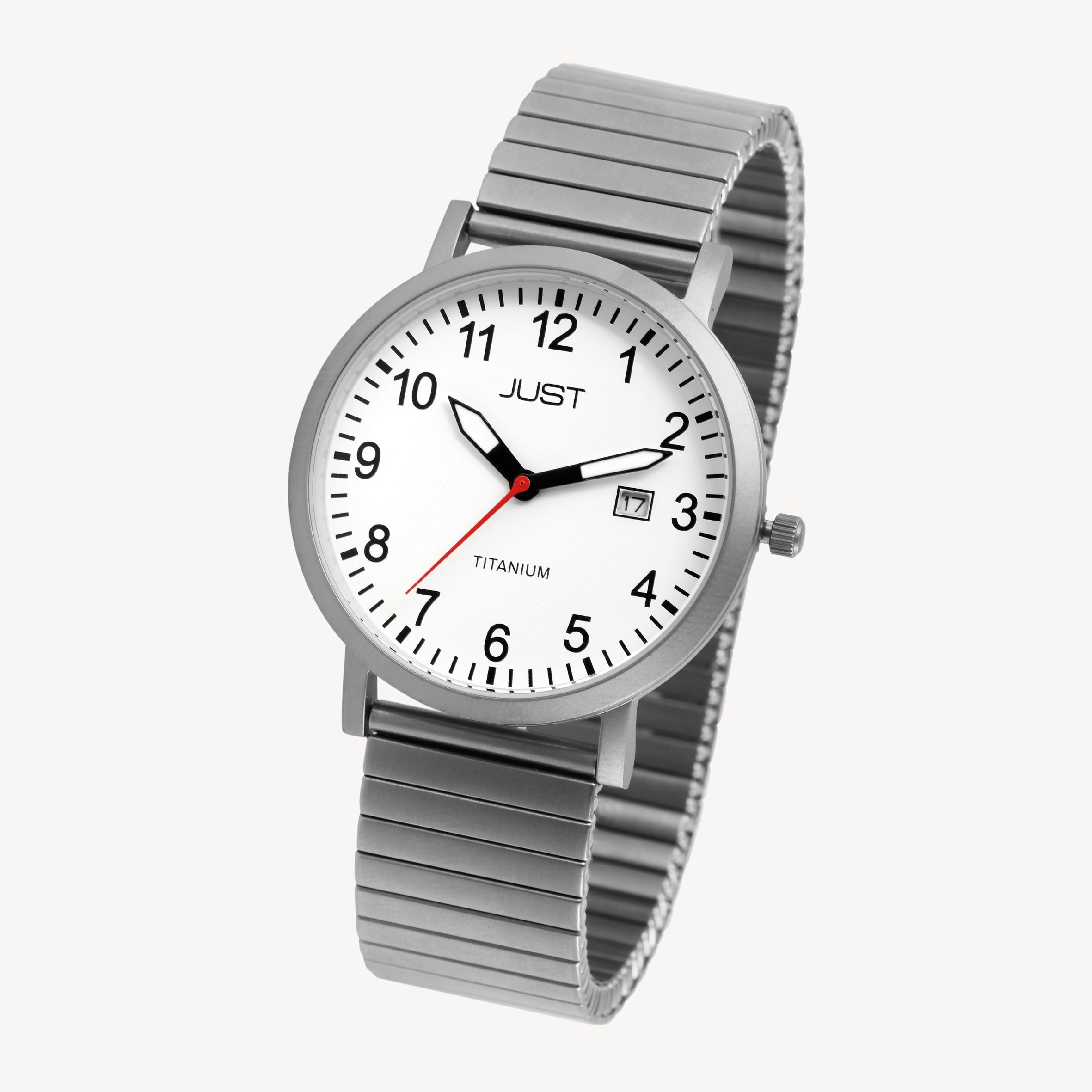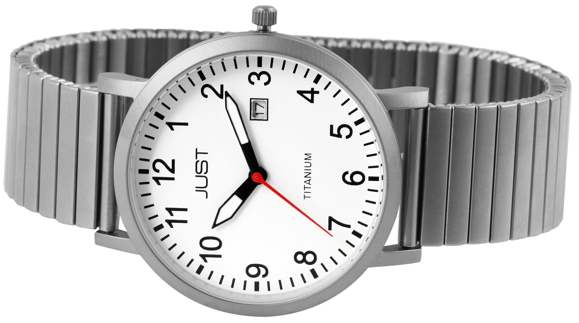 Productinformatie "Just herenhorloge met trekband, titanium, 5 ATM, witte wijzerplaat"