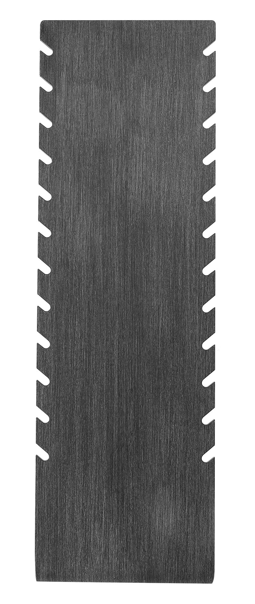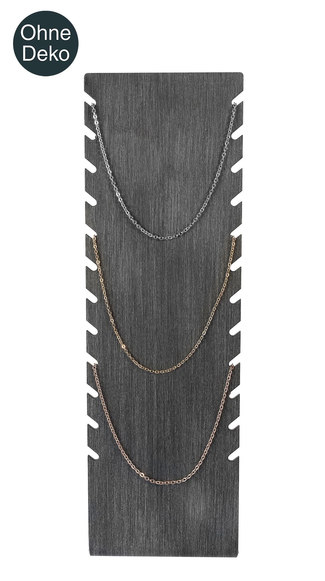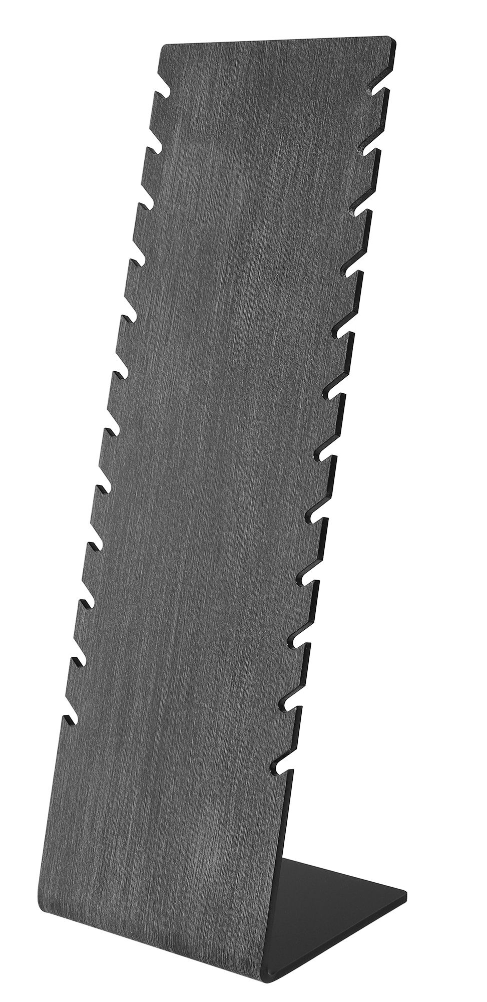 De sieradenstandaard is verkrijgbaar in wit of zwart. Hij is geschikt voor het uitstallen van kettingen, armbanden en enkelbanden. De standaard is gemaakt uit één stuk. Hij is 8 cm breed, 25 cm hoog en heeft een 10 cm lange voet. Op een hoogte van 0,5 cm, gemeten vanaf de bovenkant, zijn aan beide zijden 24 inkepingen gelijkmatig verdeeld in een rij voor het ophangen van kettingen, armbanden en enkelbanden, waardoor twaalf kettingen tegelijkertijd kunnen worden gepresenteerd in een georganiseerde rangschikking. Het opvallende oppervlak benadrukt het uiterlijk van de sieraden en presenteert ze op hun best. Een eenvoudige presentatiemogelijkheid waarmee je veel kunt bereiken. Het artikel wordt zonder decoratie geleverd.