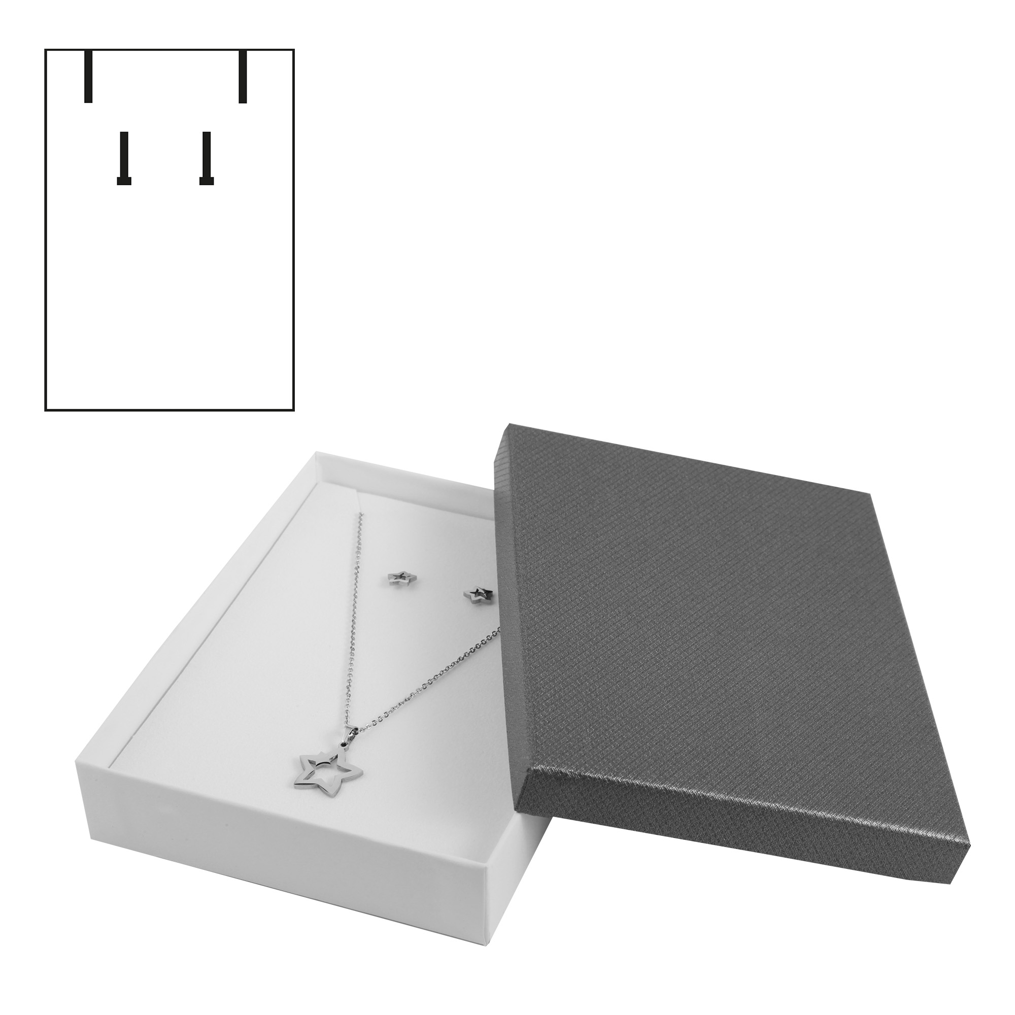 De juwelenverpakking, bestaande uit twaalf stuks in een verpakking, is gemaakt van hoogwaardig en robuust karton. Niet alleen de kwaliteit is indrukwekkend, maar ook het ontwerp van de sieradenverpakking maakt een stijlvolle en elegante indruk. De doosjes zijn verkrijgbaar in verschillende kleuren. Het filigraanpatroon op het deksel zorgt voor een hoogwaardige uitstraling. Binnenin zit een witte inleg, die bedekt is met een laag stof. Het doosje is ideaal voor het presenteren en bewaren van verschillende sieraden. Dankzij het inzetstuk is het mogelijk om een set bestaande uit een halsketting en oorstekers te presenteren. De afmetingen van de sieradendoos zijn 16 cm lang, 12 cm breed en 3 cm diep.